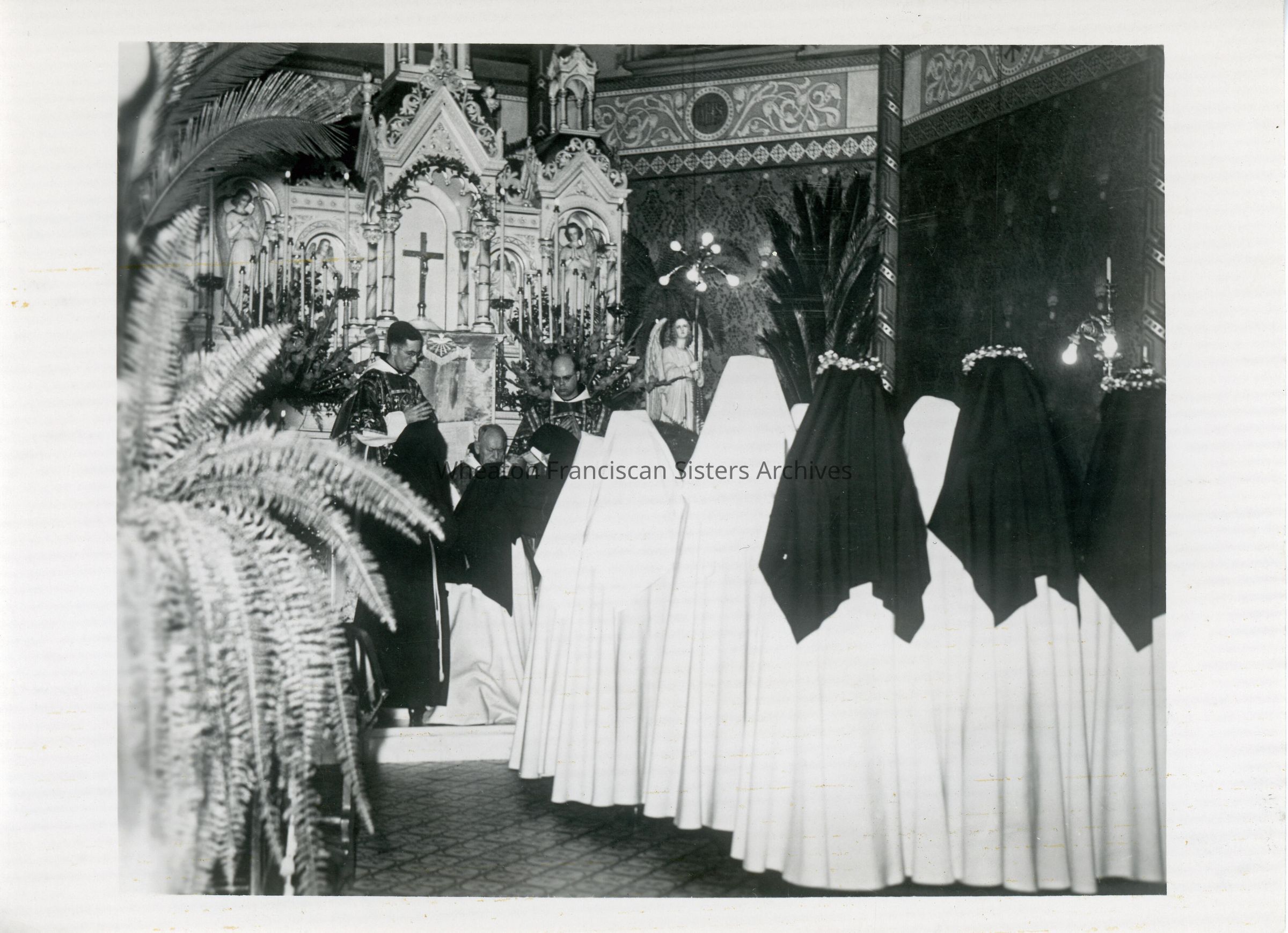 The chapel in St. Anthony’s Hospital located at 3520 Chippewa Street in St. Louis, Missouri. Novices are gathered near the altar. Sister Agnes (Leander) Huelsing is near the center and dressed in all white.