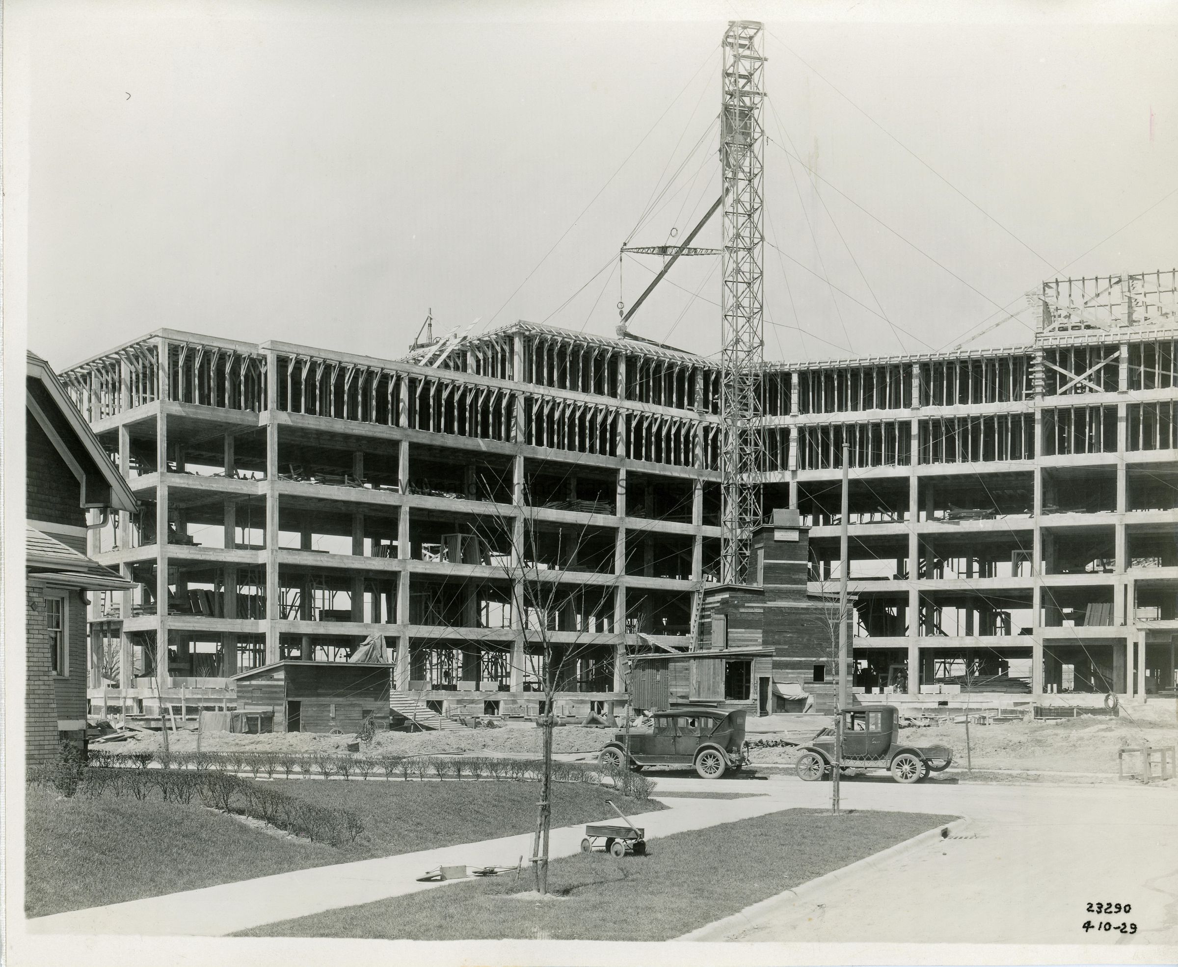 Construction of St. Joseph's Hospital located at 5000 West Chambers Street in Milwaukee, Wisconsin. The contractor is listed as W. W. Oeflein Inc.