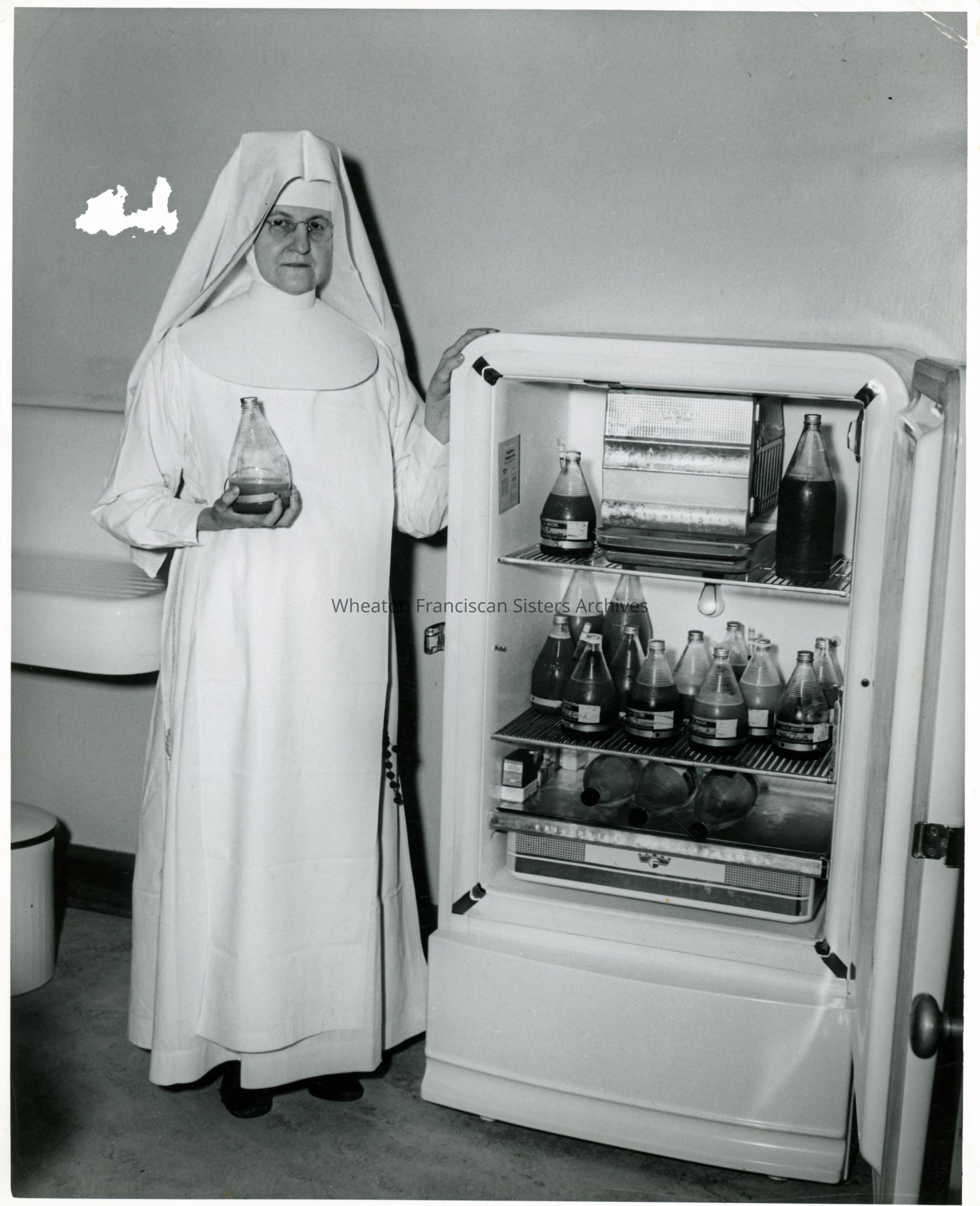 St. Andrew's Hospital located in the 100 Block of South 6th Street in Murphysboro, Illinois. This image features Sister Agnes (Priscilla) Robers with the hospital's blood bank.