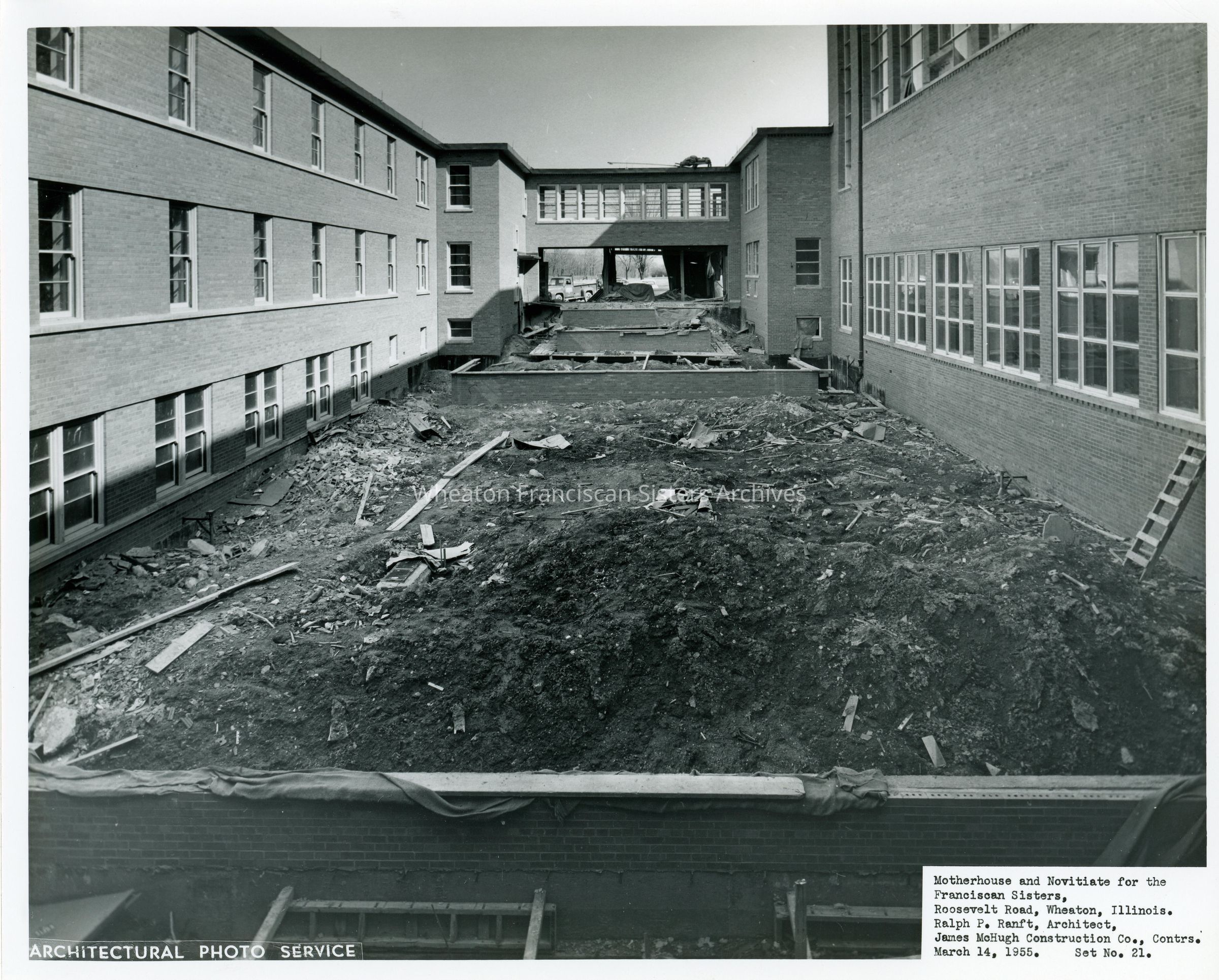 Construction of the Our Lady of Angels Motherhouse and Novitiate at 26W171 Roosevelt Road in Wheaton, Illinois. This image looks north through the inner courtyard. The photo lists Ralph P. Ranft as the architect and James McHugh Construction as the contractor.