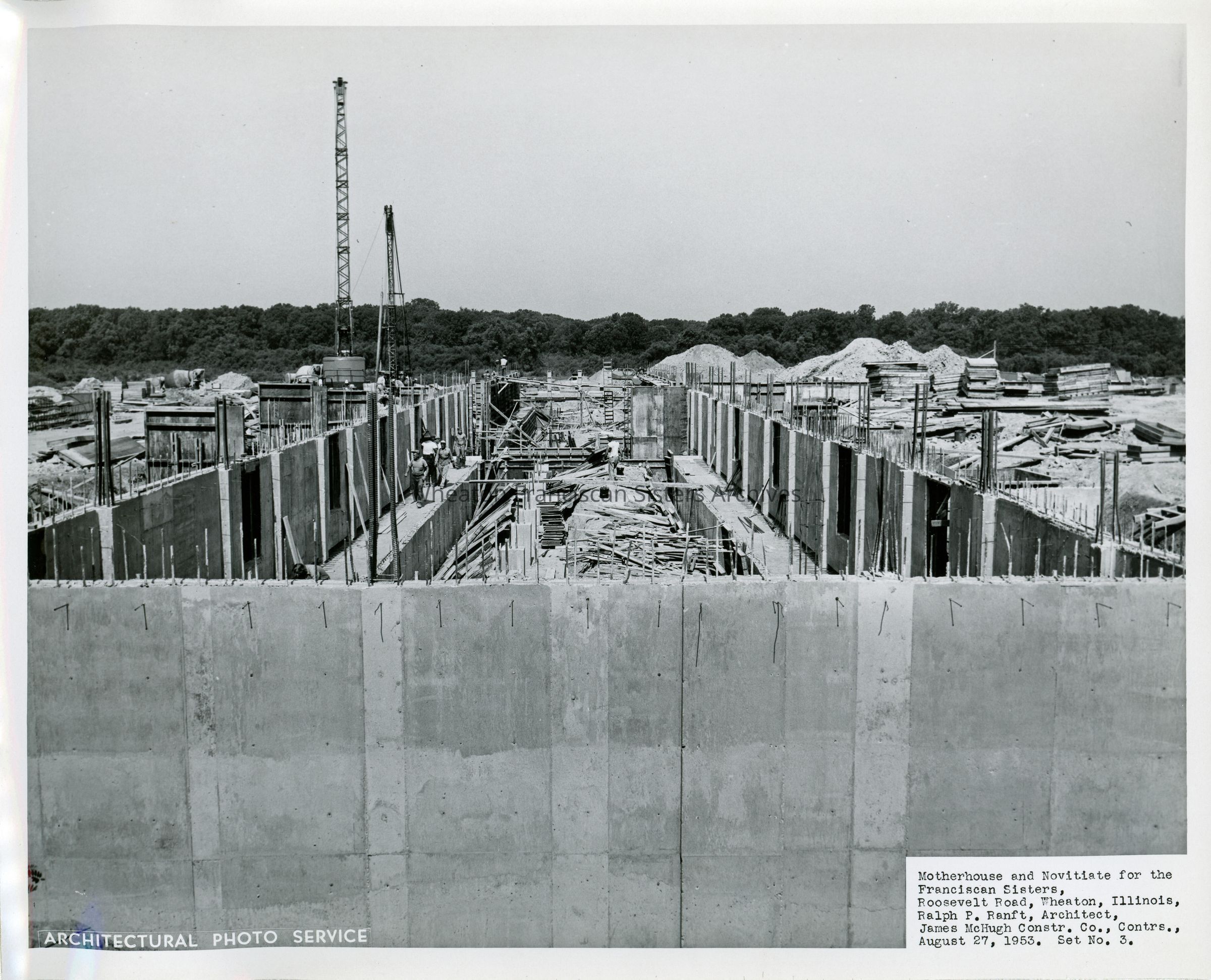 Construction of the Our Lady of Angels Motherhouse and Novitiate at 26W171 Roosevelt Road in Wheaton, Illinois. This image looks west across the foundation. The photo lists Ralph P. Ranft as the architect and James McHugh Construction as the contractor.