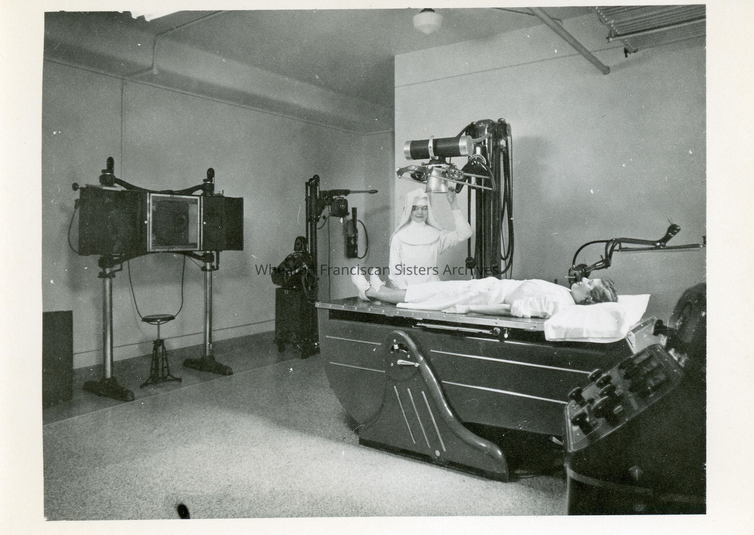 The X-Ray Department in St. Anthony’s Hospital located at 3520 Chippewa Street in St. Louis, Missouri. A Sister stands near a patient.