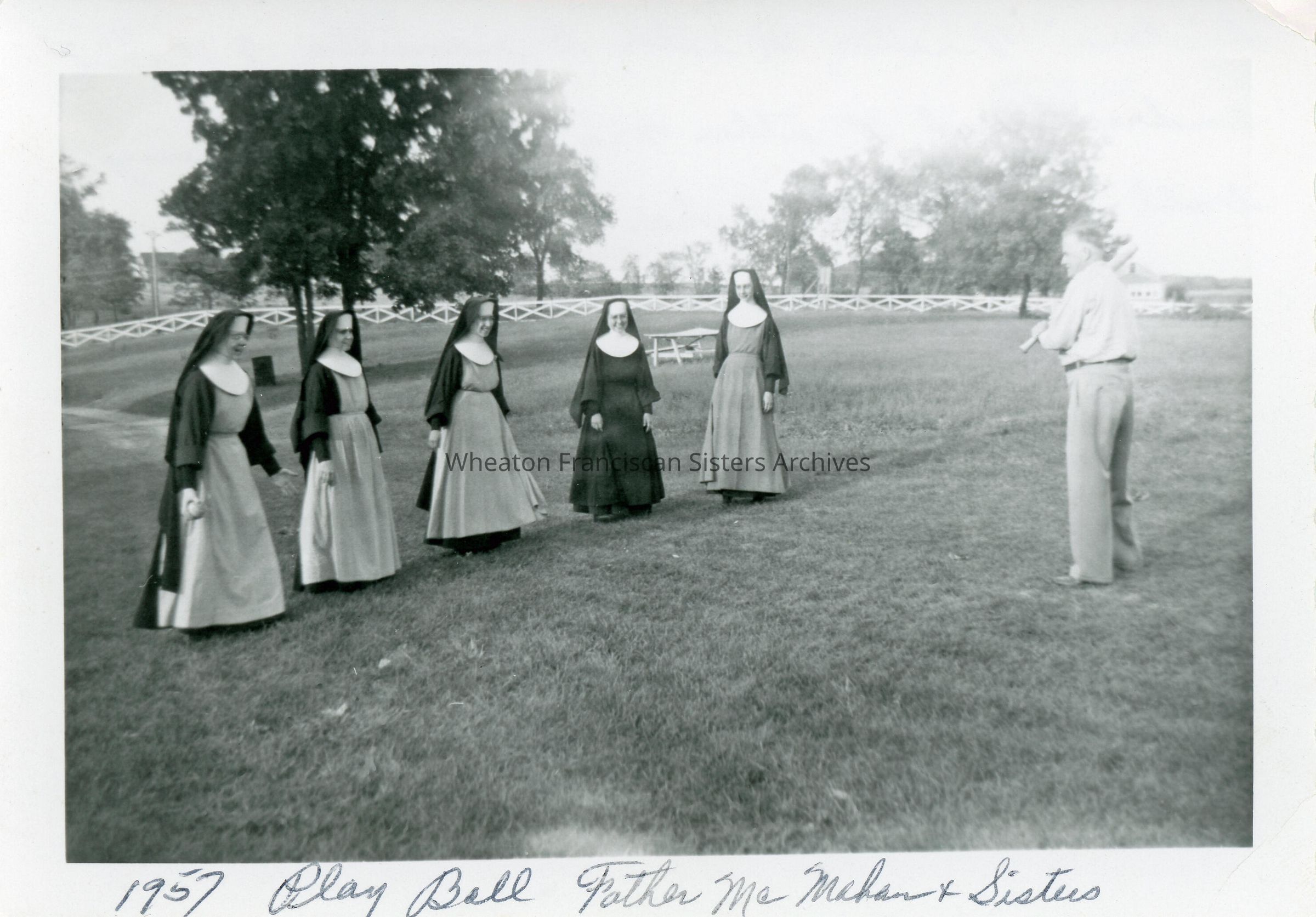 Sisters playing baseball with Father Thomas S. McMahon, Pastor of Transfiguration Parish, in Wauconda, Illinois. Present are Sister Joan (Victor) Warburton, Sister Colette (Ruth) Woltering, Sister Dorothy (Francella) Birk, Sister Anna (Elaine) Georger and Sister Mary Jane (Andrew) Hrubes. The photo was taken at Slocum Lake.
