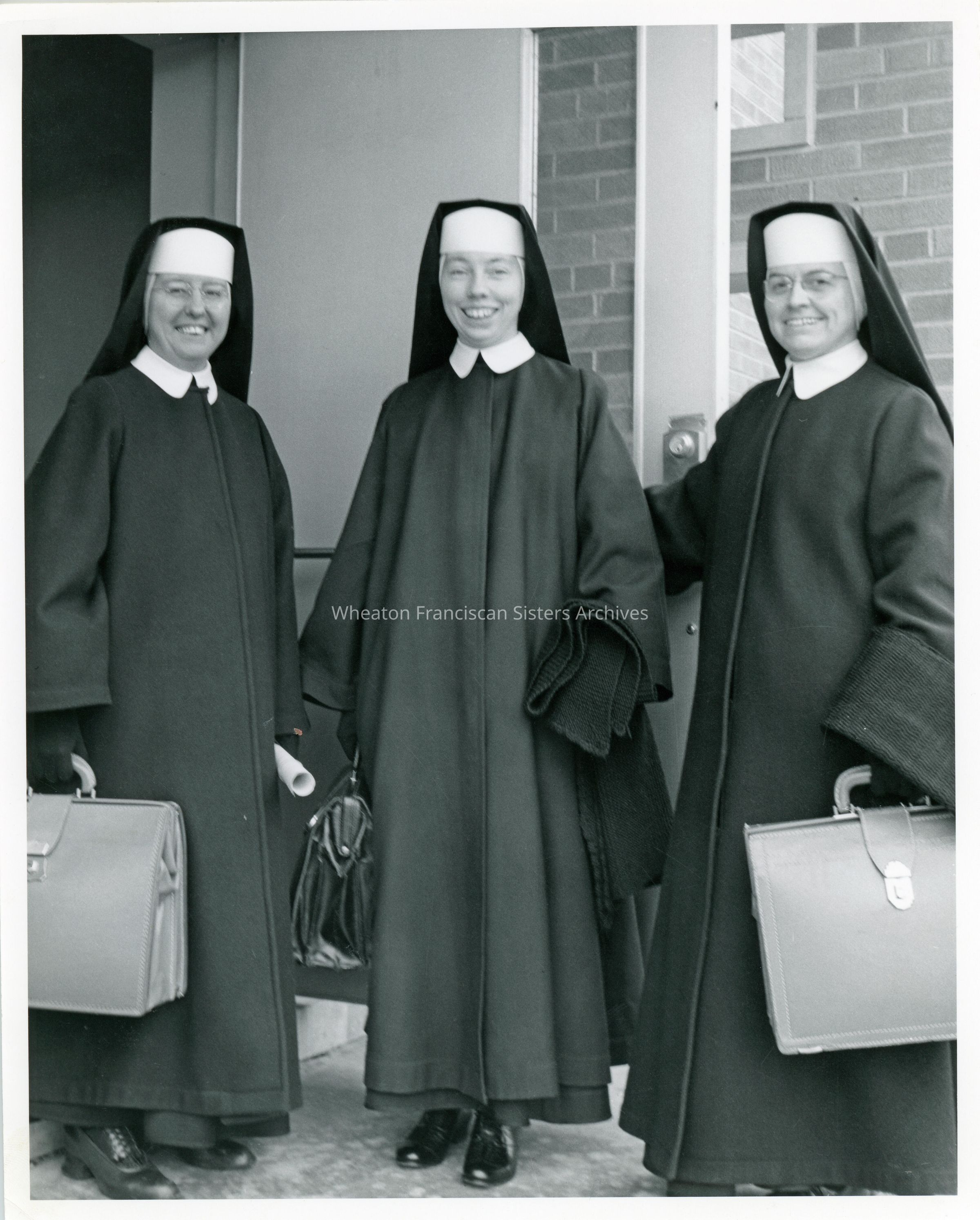 Sisters leaving the Our Lady of Angels Convent to teach at nearby St. Francis High School. This image features Sister Agnes (Johnathan) Jiskra, Sister Mary (Clare) Nyderek and Sister Florence (Jude) Roling. The school was located at 2130 West Roosevelt Road in Wheaton, Illinois.