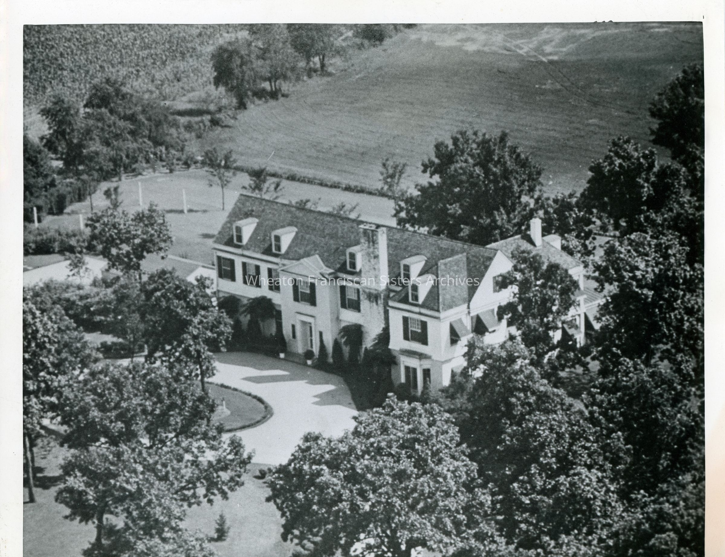 Aerial view of the Novitiate, also known as Kara Hall, in Wheaton, Illinois. Constructed in 1902 and first known as the Hurley House, the home was designed by architect Jarvis Hunt and was the personal residence of Edward N. Hurley Sr.