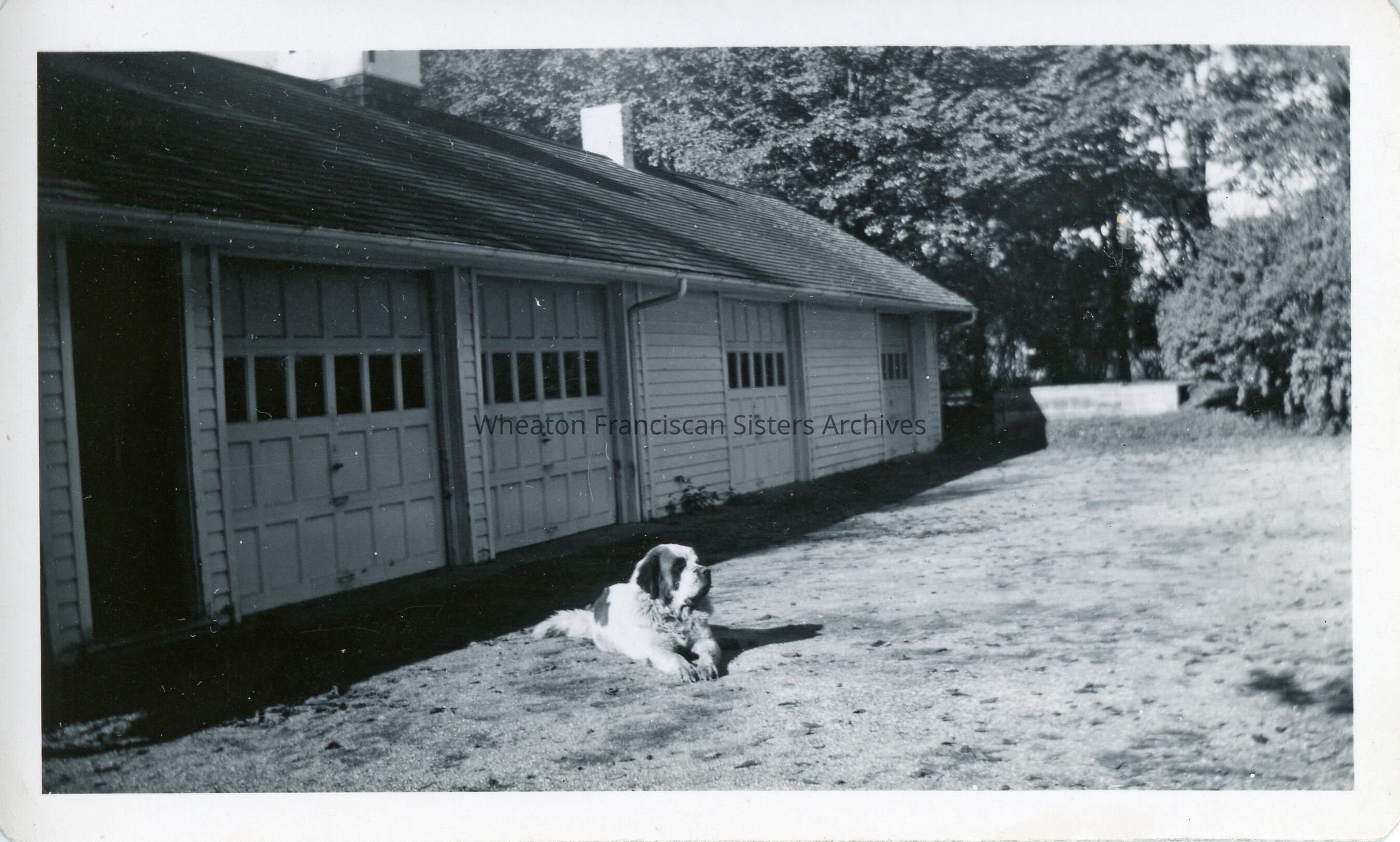 The Wheaton Franciscan Campus located in Wheaton, Illinois. This garage was situated next to the motherhouse, also known as Maura Hall. The dog in the photo was a St. Bernard named Koko.