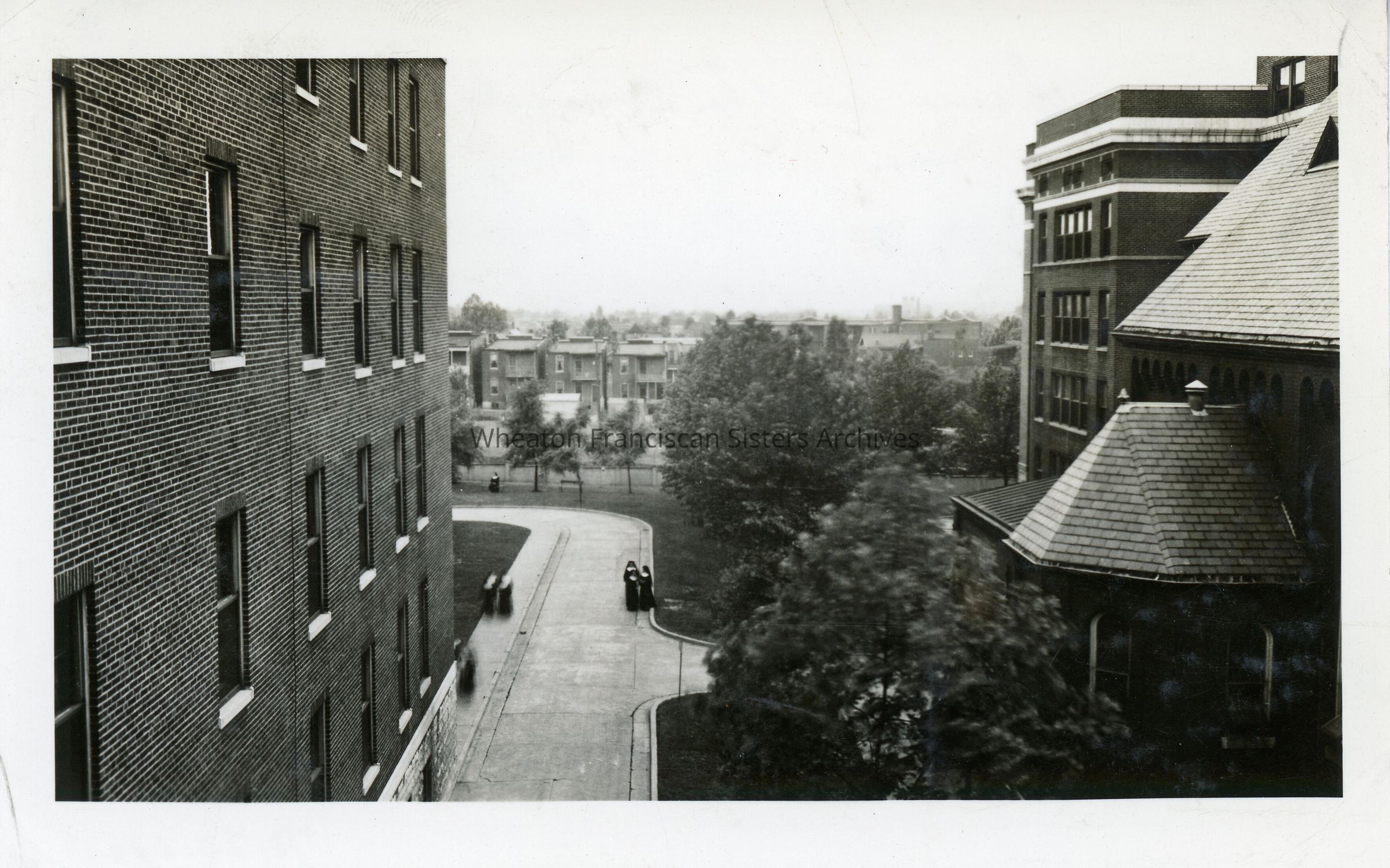 St. Anthony’s Hospital, Novitiate and Motherhouse located at 3520 Chippewa Street in St. Louis, Missouri. Looking toward Keokuk Street, the South Annex is on the left while the Novitiate and chapel are on the right. Sisters are visible in the courtyard.