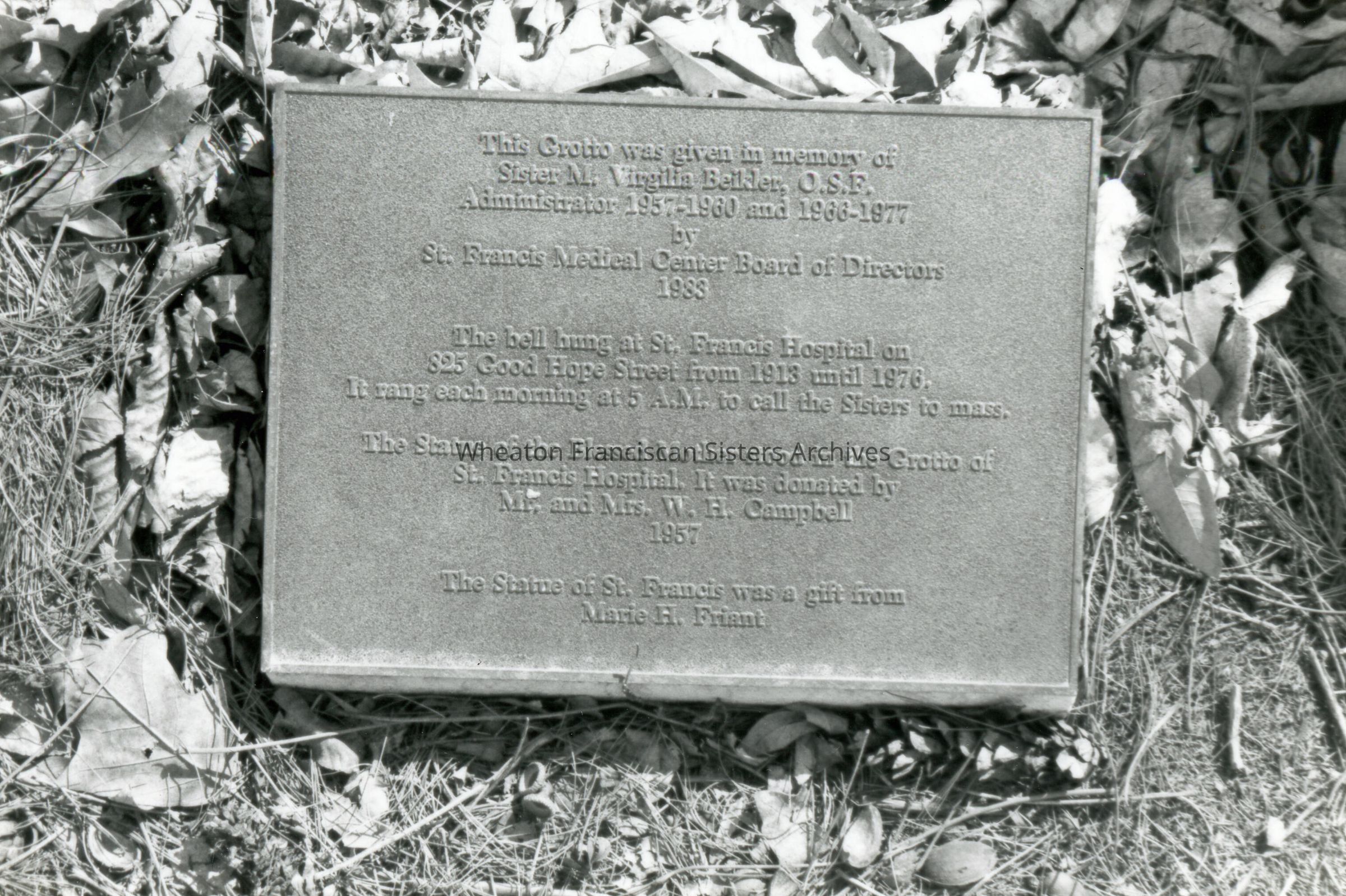 St. Francis Medical Center at 211 St. Francis Drive in Cape Girardeau, Missouri. The image features a grotto on the hospital campus. Dedicated in memory of Sister Gertrude (Virgilia) Beikler, a nearby statue and bell were taken from the previous hospital building at 325 Good Hope Street.