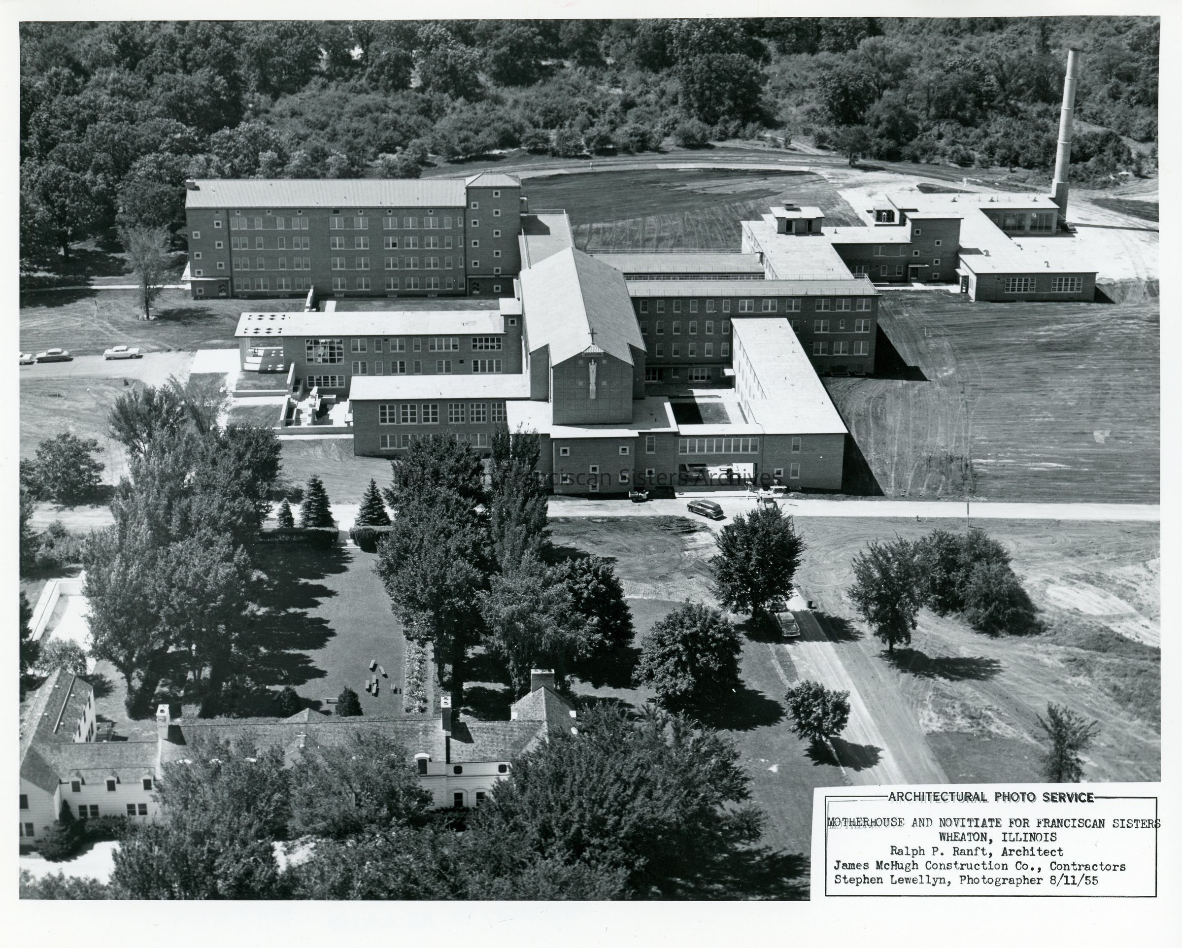 Aerial photo of the Our Lady of Angels Motherhouse and Novitiate at 26W171 Roosevelt Road in Wheaton, Illinois. Looking south, the main entrance, later known as entrance seven, is on the left. In addition, the chapel is situated near the center and Maura Hall is toward the bottom. The photo lists Ralph P. Ranft as the architect and James McHugh Construction as the contractor.