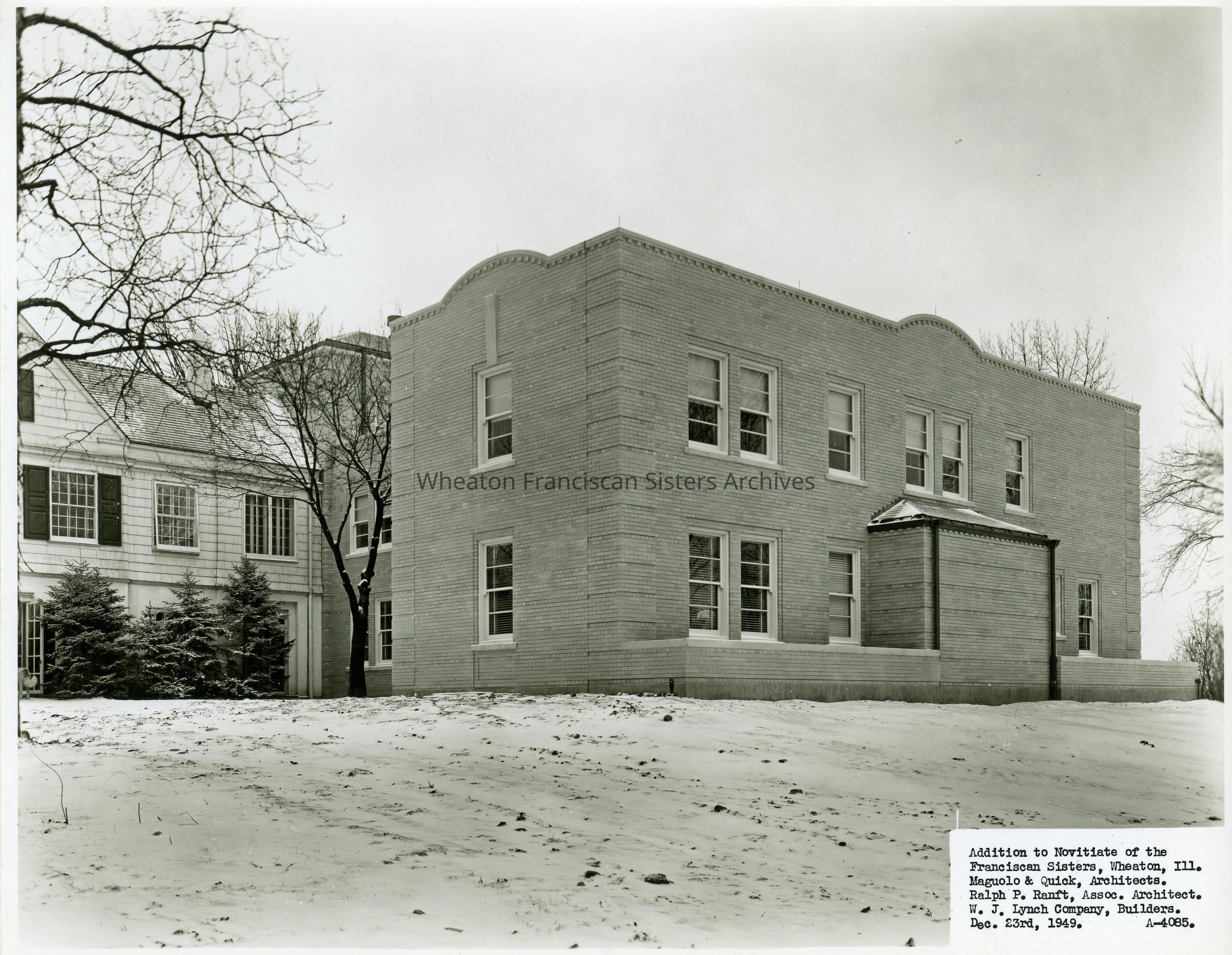 The completed addition to the Novitiate, also known as Kara Hall, in Wheaton, Illinois. This wing held a chapel. Visible on the left, the original home was constructed in 1902 and was first known as the Hurley House. Designed by architect Jarvis Hunt, it was the personal residence of Edward N. Hurley Sr. The photo lists Maguolo & Quick as architects, Ralph P. Ranft as associate architects and the W.J. Lynch Company as builders.