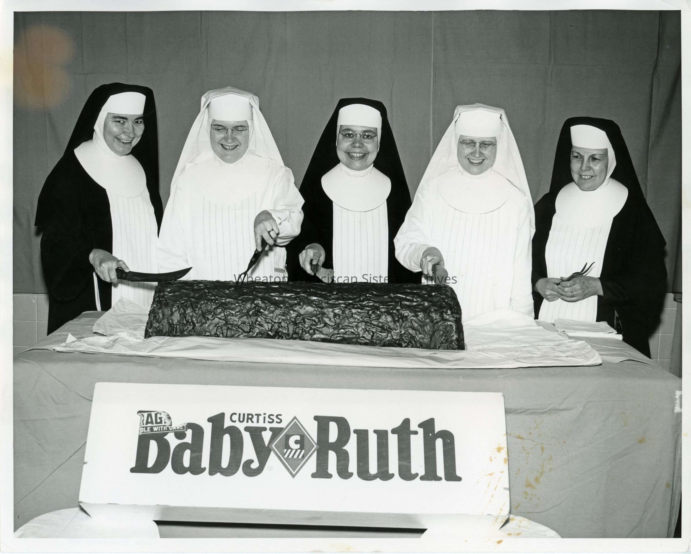St. Francis Hospital at 825 Good Hope Street in Cape Girardeau, Missouri. The image features Sisters with a one hundred pound Baby Ruth. The candy bar was given to St. Francis Hospital for distribution among children attending the M.C.C.S. Outpatient Clinic. From left to right are Sister Kathryn (Claudia) Glasser, Sister Helene, Sister Jane Mary (Francisann) MacDonald, Sister Juanita and Sister Kathleen (Norene) Staeck. Opened in 1914, this hospital replaced an older structure located at Sprigg and Williams Streets. St. Francis remained here until 1976 and the building was demolished in 2000. Affordable housing now occupies the site.