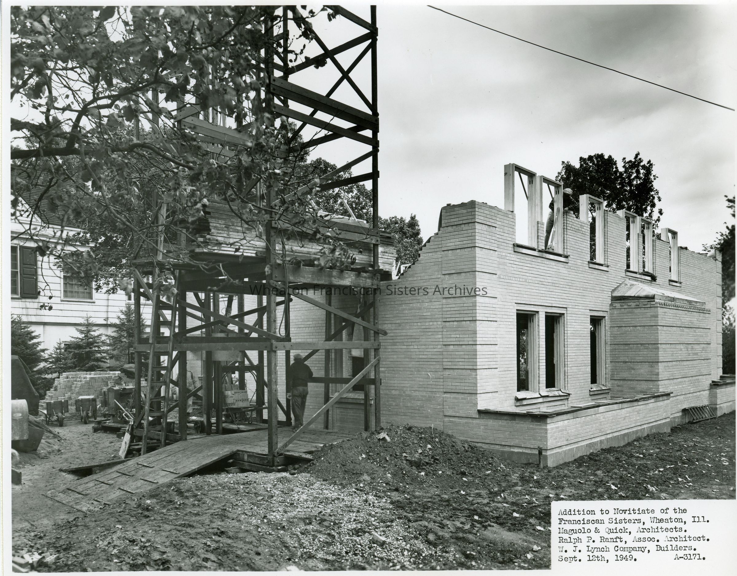 In 1947, the Franciscan Sisters acquired a large tract of land in Wheaton which included this structure. From approximately 1947 - 1955, it was used by the Sisters as a novitiate and saw extensive renovations in 1949. Beginning around 1956, it was home to the Our Lady of the Angels Aspirancy, and in the following decades, saw use as a coffee house, daycare, offices and more. Located in the southeast corner of the campus, the home and subsequent addition were demolished in 2009 after their condition had deteriorated.Context