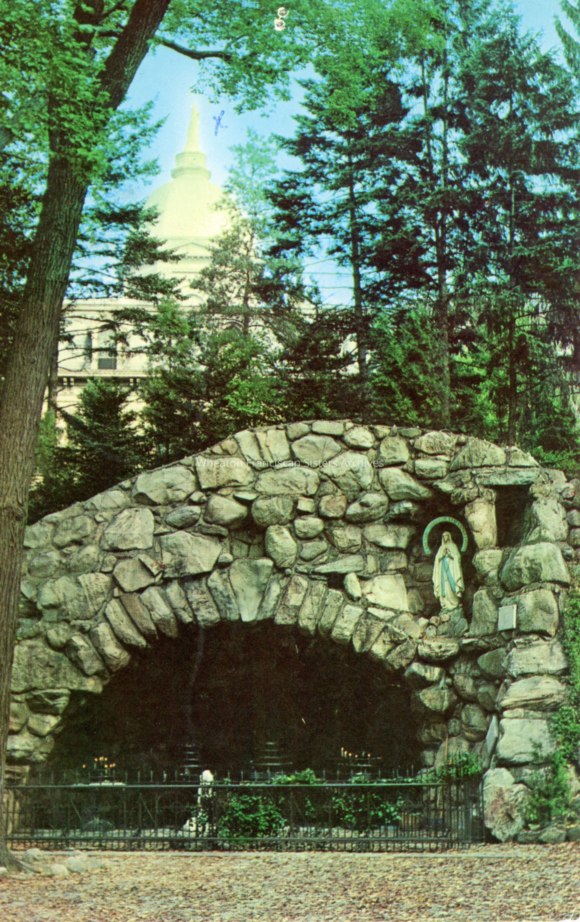 Postcard of the University of Notre Dame Grotto in South Bend, Indiana. There is a handwritten message on the back from Sister Gertrude (Virgilia) Beikler to Sister Rose (Valentia) Amrhein. The postcard was sent to St. Francis Hospital located at 825 Good Hope Street in Cape Girardeau, Missouri.