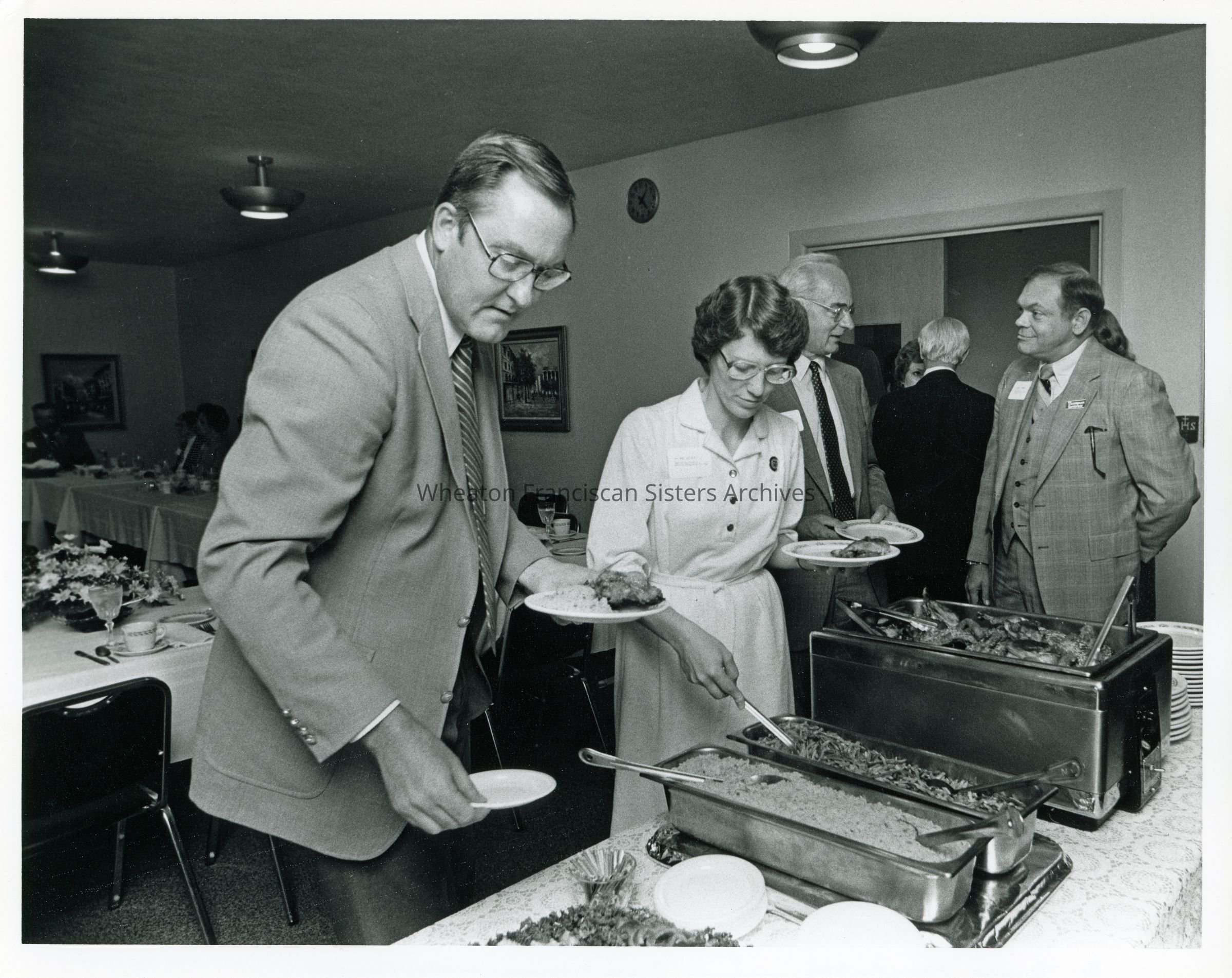 Gathering at Marianjoy Rehabilitation Hospital in Wheaton, Illinois. From left to right are Illinois Governor Jim Thompson, Sister Mary Lou (Agnes) Wirtz, unknown and Bruce Schurman, CEO of Marianjoy.