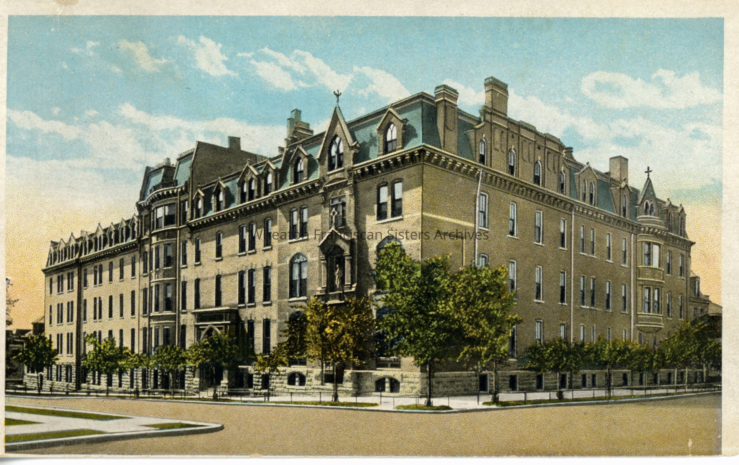 Postcard of the first St. Joseph's Hospital located at 4th Street and Reservoir Avenue in Milwaukee, Wisconsin. This structure was completed in November of 1883 and underwent several expansions in the following decades. In 1928, the building was sold to the Milwaukee Dispensary and Maternity Association. Less than ten years later, it was returned to the Franciscan Sisters and was renamed the St. Joseph's Hospital Annex. In 1940, the name was changed to St. Michael's Hospital. Ultimately, this structure was demolished around 1980.