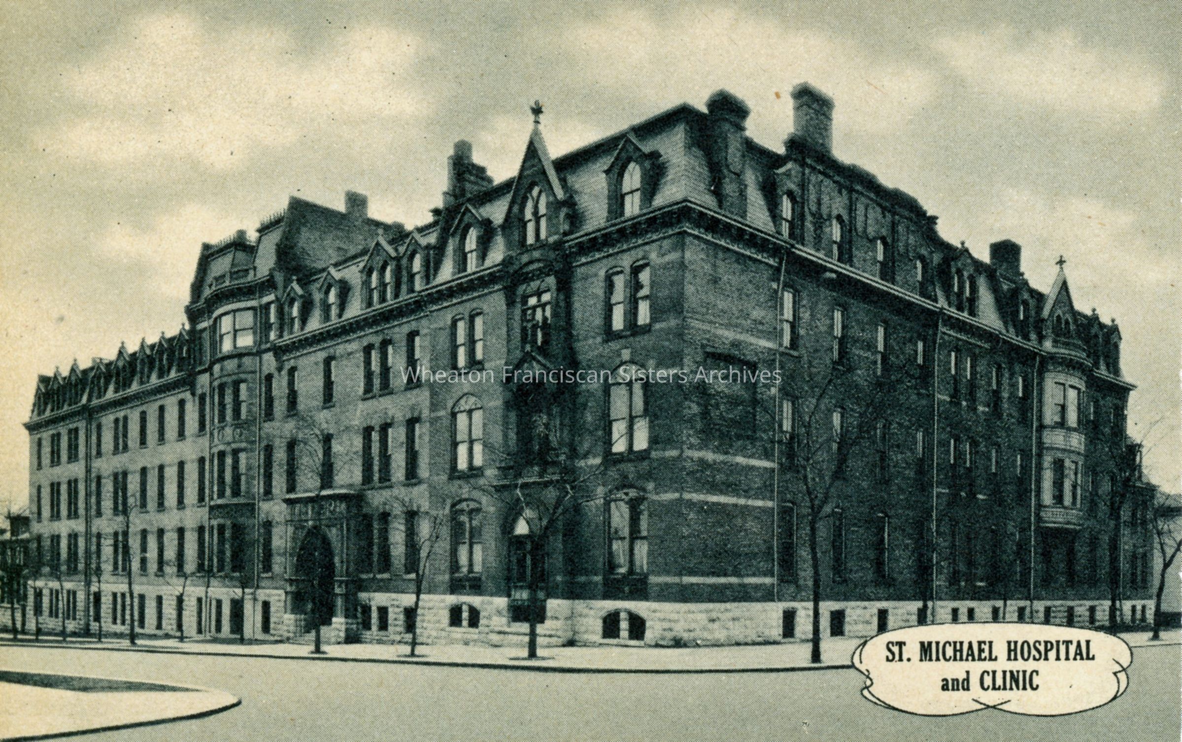 Postcard of St. Michael's Hospital, formerly St. Joseph's Hospital, located at 4th Street and Reservoir Avenue in Milwaukee, Wisconsin. This structure was completed in November of 1883 and underwent several expansions in the following decades. In 1928, the building was sold to the Milwaukee Dispensary and Maternity Association. Less than ten years later, it was returned to the Franciscan Sisters and was renamed the St. Joseph's Hospital Annex. In 1940, the name was changed to St. Michael's Hospital. Ultimately, this structure was demolished around 1980.