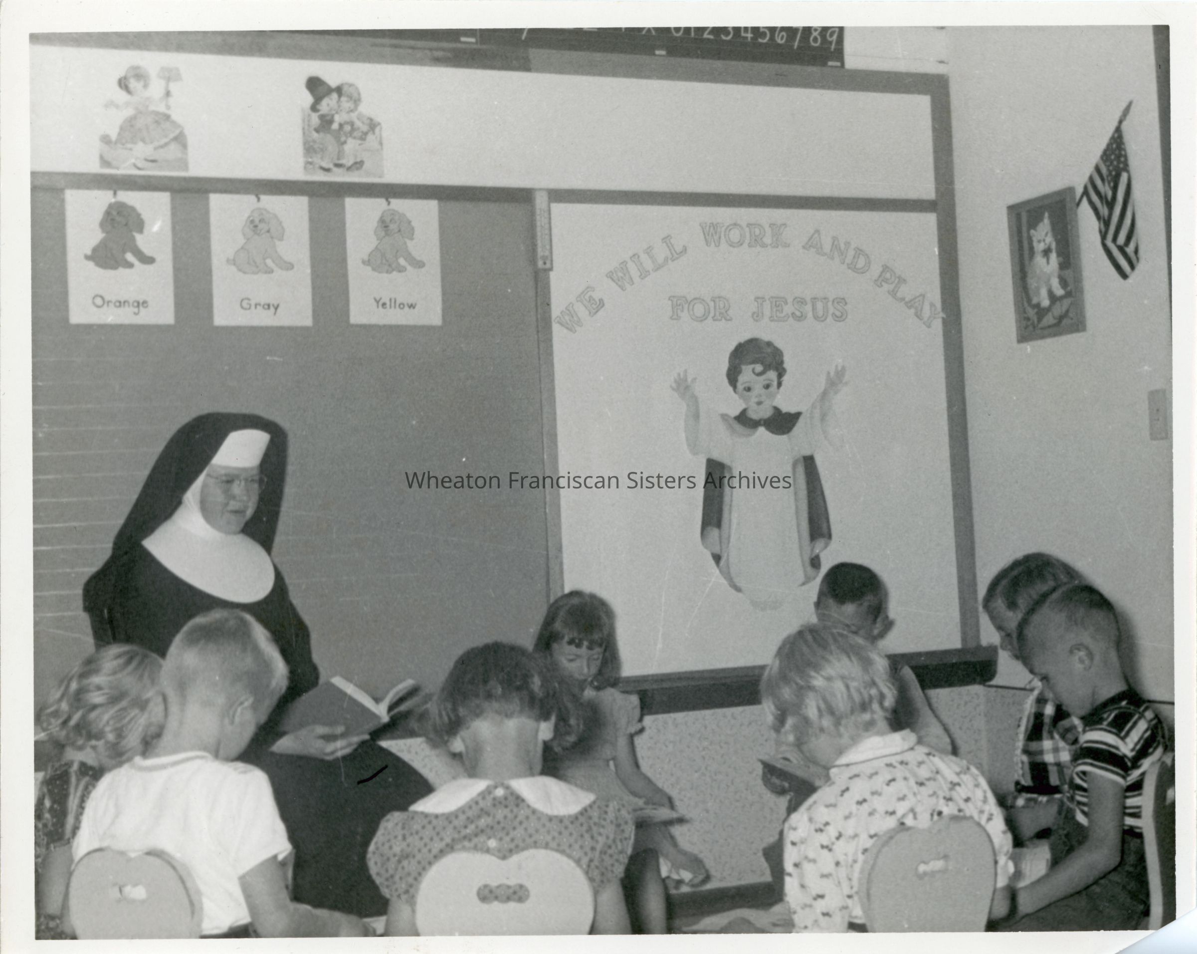 St. Joseph's School in Raymond, Iowa. This image features Sister Theresa (Pauline) Langfield teaching first and second grade.