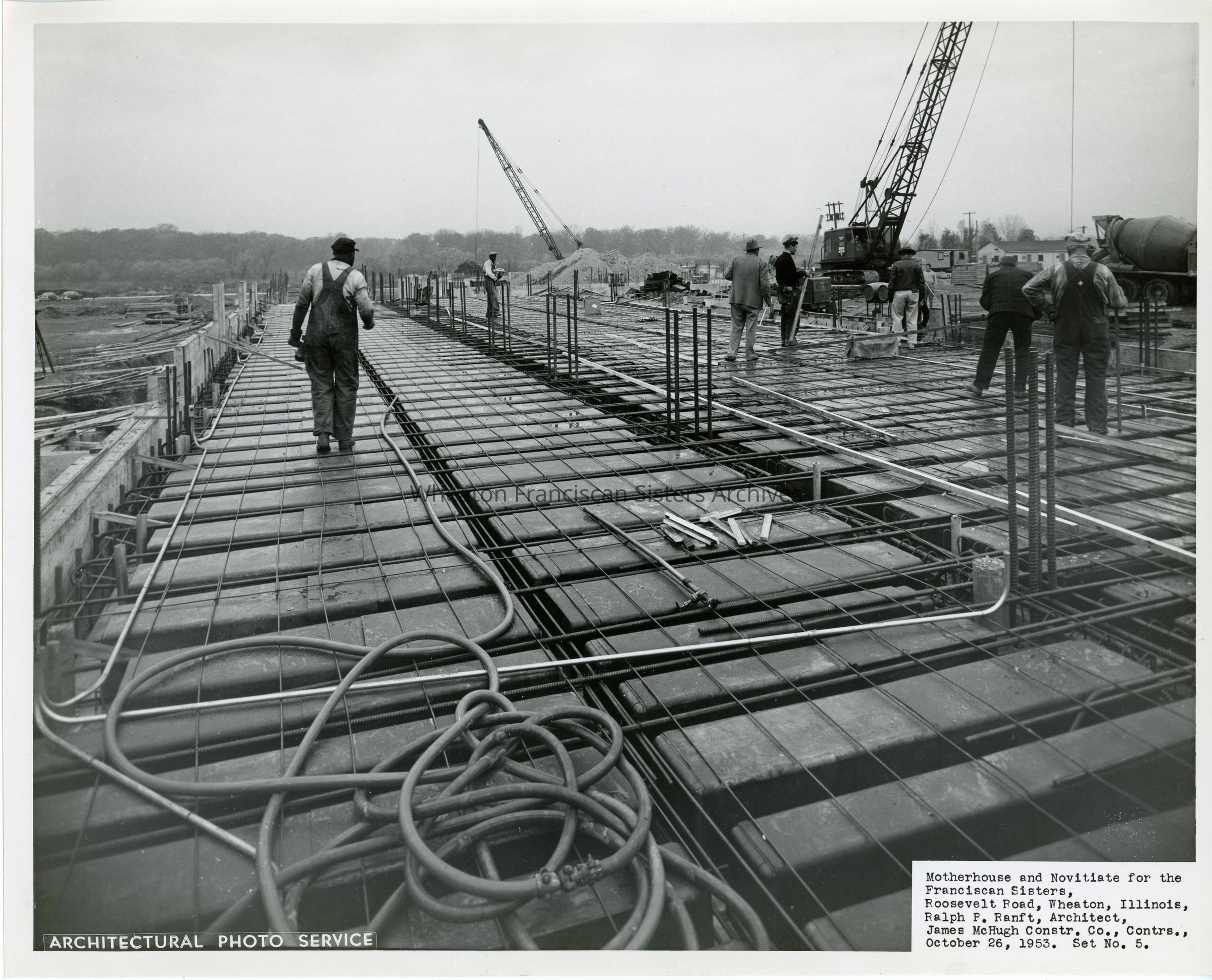 Construction of the Our Lady of Angels Motherhouse and Novitiate at 26W171 Roosevelt Road in Wheaton, Illinois. This image looks west toward the south end of the building. The photo lists Ralph P. Ranft as the architect and James McHugh Construction as the contractor.