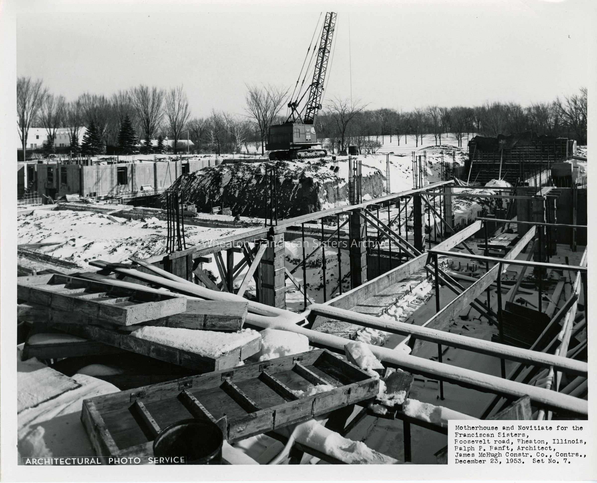 Construction of the Our Lady of Angels Motherhouse and Novitiate at 26W171 Roosevelt Road in Wheaton, Illinois. This image looks northeast toward the northeast section of the building. Maura Hall, then being used as the motherhouse, is visible on the far left. The photo lists Ralph P. Ranft as the architect and James McHugh Construction as the contractor.