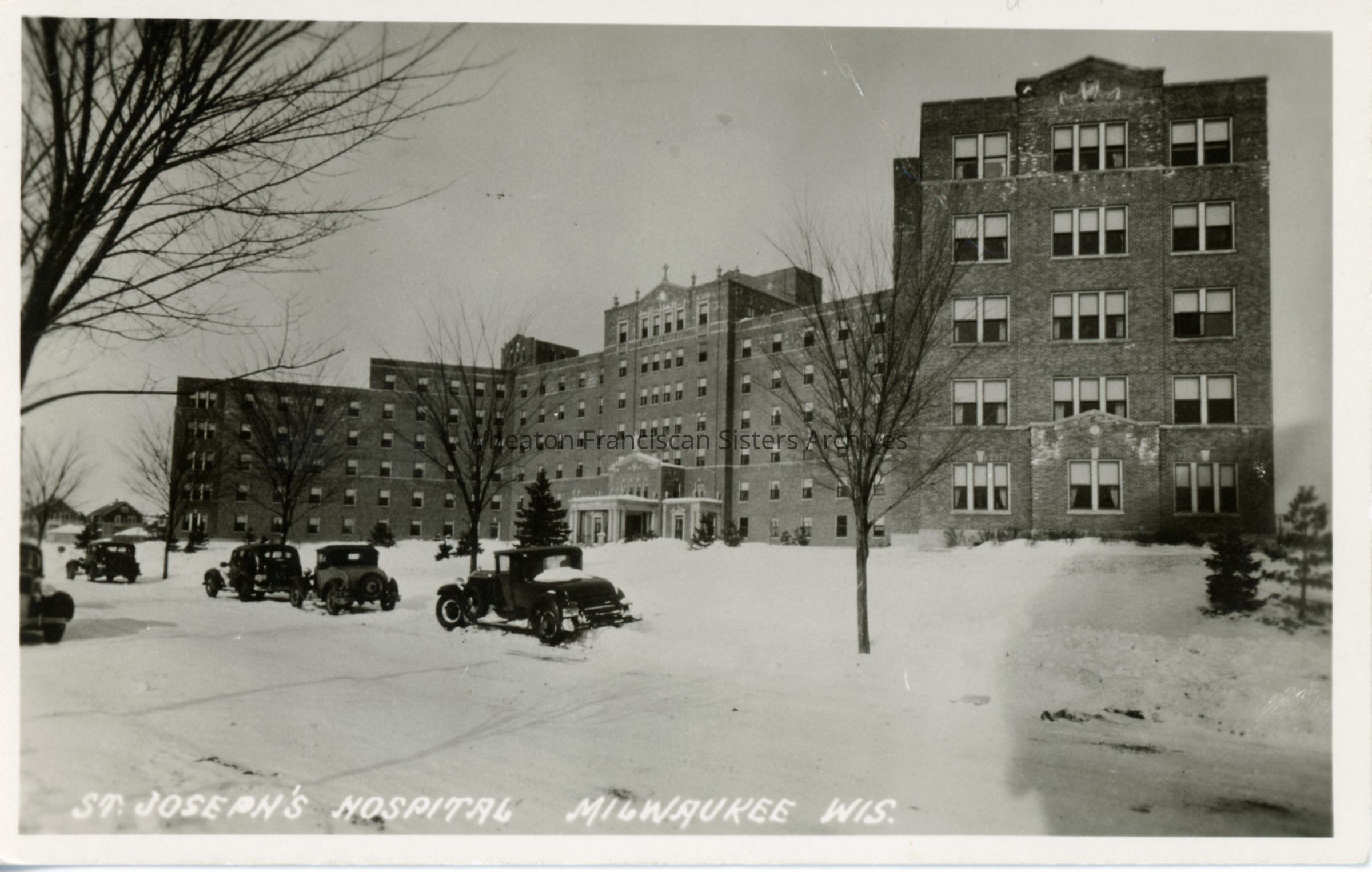 Postcard of St. Joseph's Hospital located at 5000 West Chambers Street in Milwaukee, Wisconsin. There is a typed message on the back addressed to Sister Maria (Maura) Rossmeissl at St. Anthony's Hospital in St. Louis, Missouri.