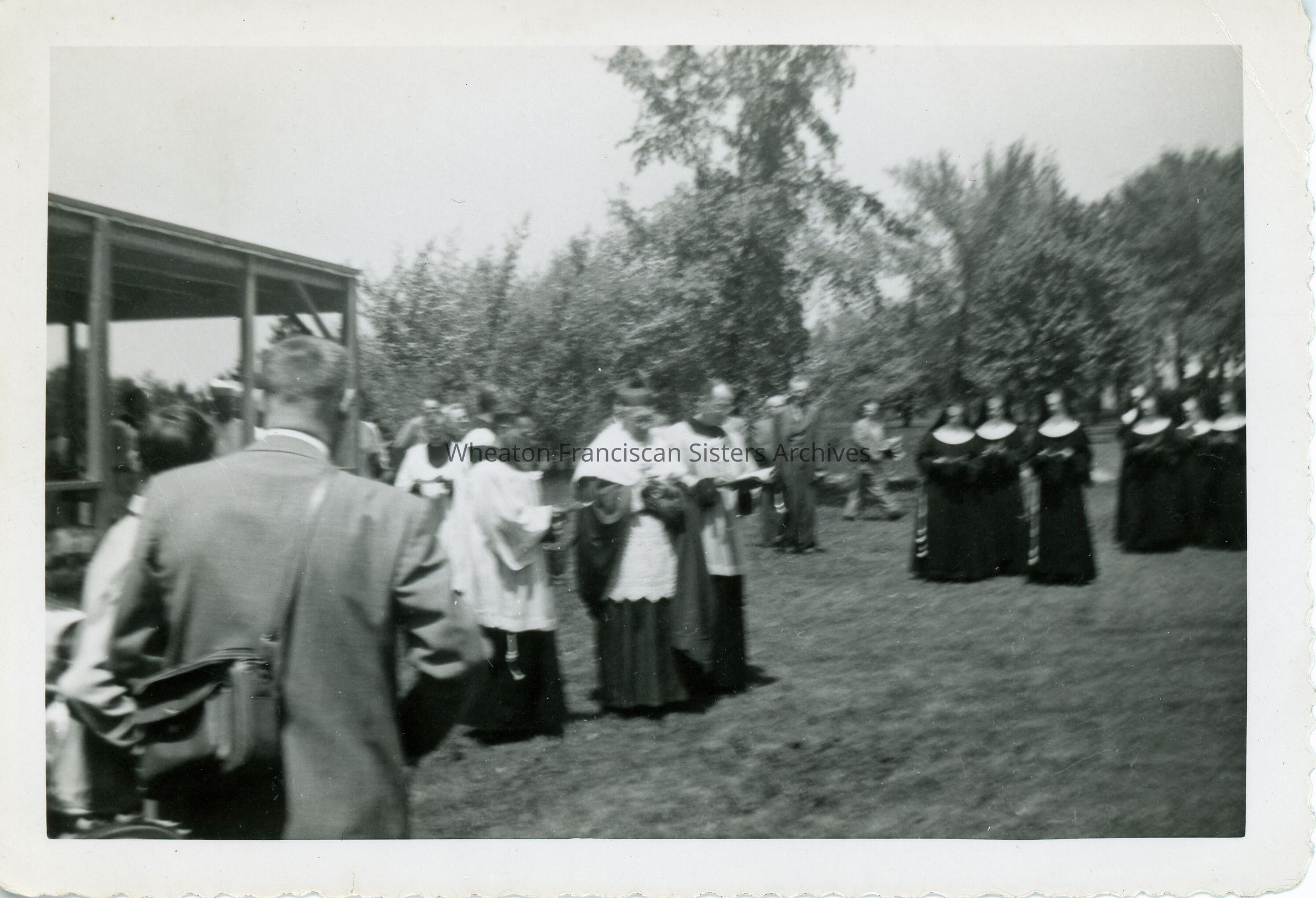 Groundbreaking ceremony for the Our Lady of Angels Motherhouse at 26W171 Roosevelt Road in Wheaton, Illinois. The shelter on the left held a large architectural model of the campus. A number of Sisters are standing on the right.