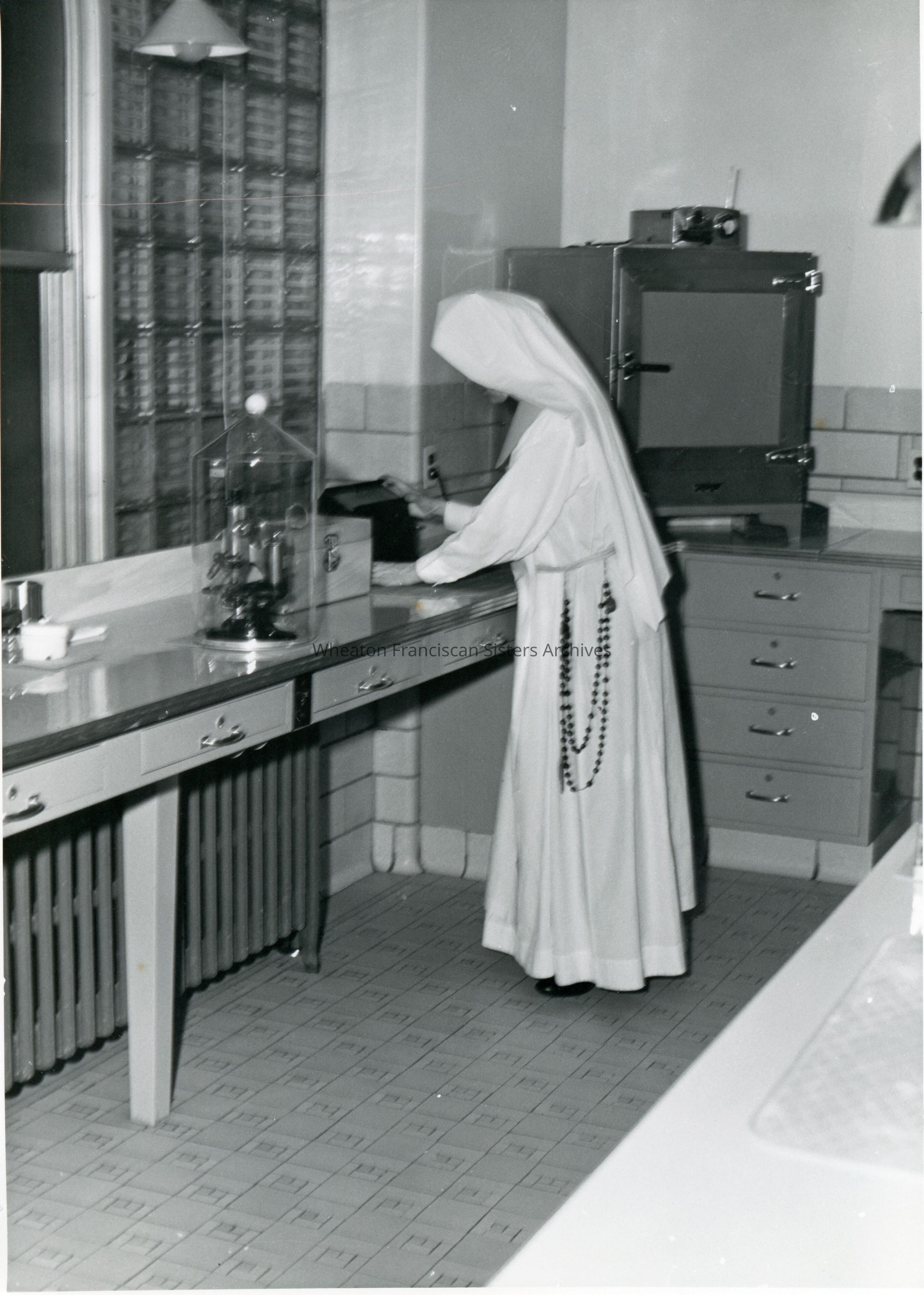 St. Francis Hospital at 825 Good Hope Street in Cape Girardeau, Missouri. The image features Sister Loretta (Terasine) Paar working in a lab. Opened in 1914, this hospital replaced an older structure located at Sprigg and Williams Streets. St. Francis remained here until 1976 and the building was demolished in 2000. Affordable housing now occupies the site.