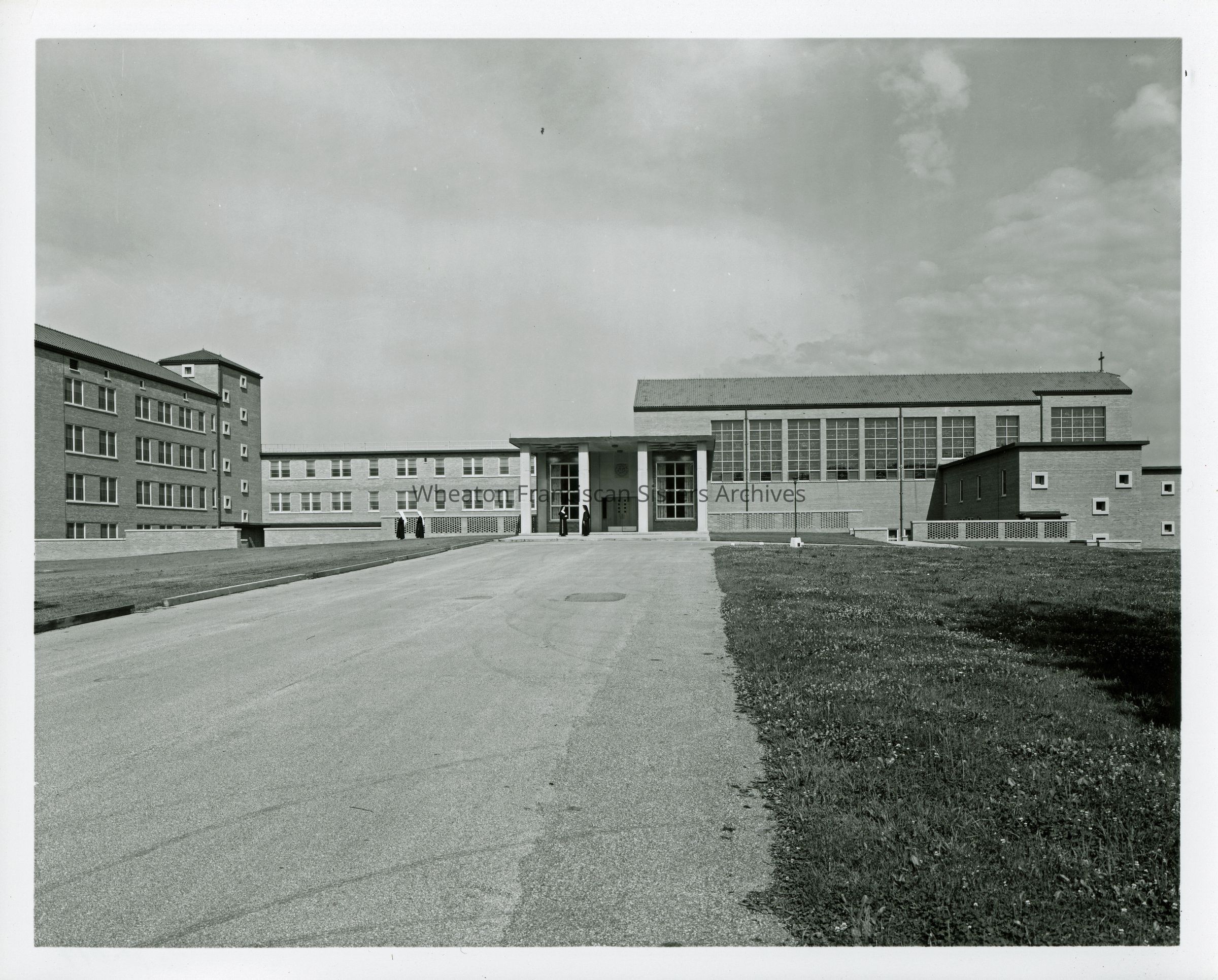 The Our Lady of Angels Motherhouse and Novitiate at 26W171 Roosevelt Road in Wheaton, Illinois. This image looks northwest toward the front entrance, later known as entrance seven. The chapel is on the right and four Sisters stand near the doors.