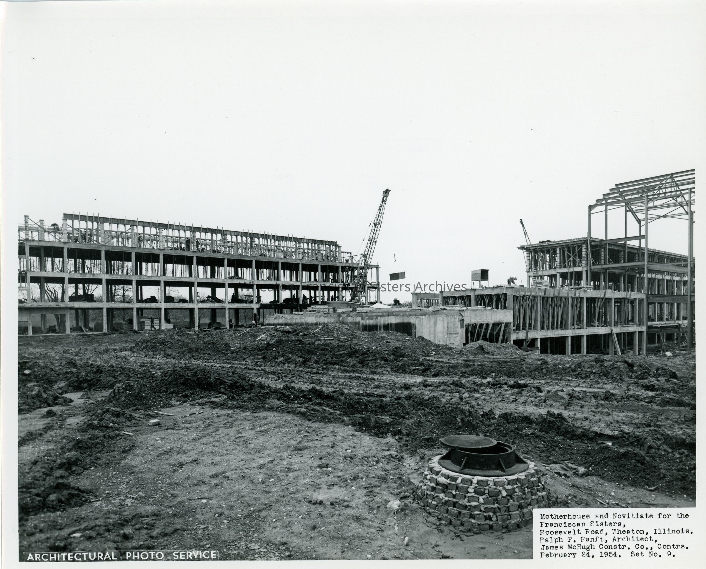 Construction of the Our Lady of Angels Motherhouse and Novitiate at 26W171 Roosevelt Road in Wheaton, Illinois. This image looks southwest toward the east side of the building. The novitiate is on the left and the chapel is on the right. The photo lists Ralph P. Ranft as the architect and James McHugh Construction as the contractor.