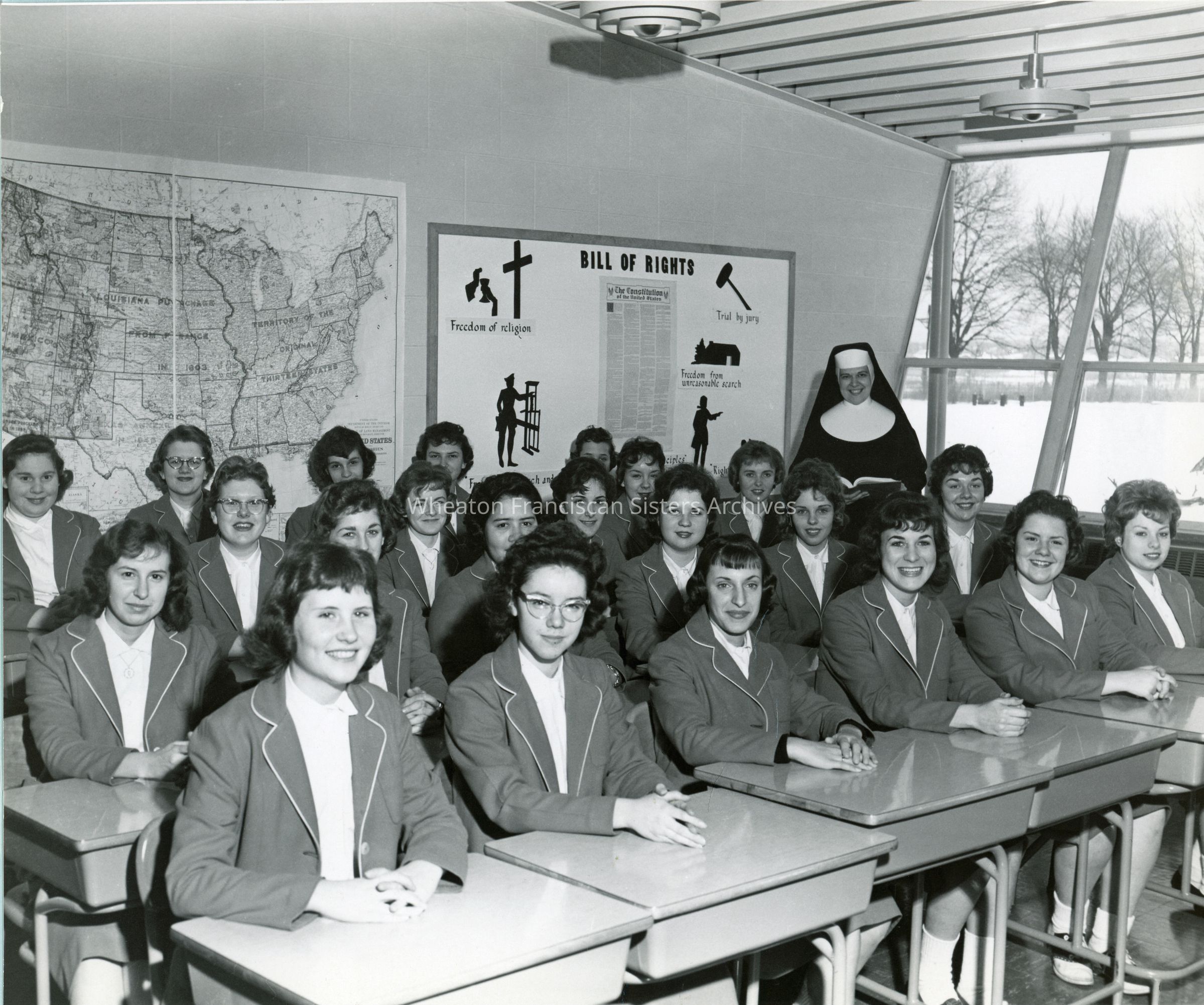 St. Francis High School located at 2130 West Roosevelt Road in Wheaton, Illinois. Sister Lucille (Marilyn) Marin is pictured with students.