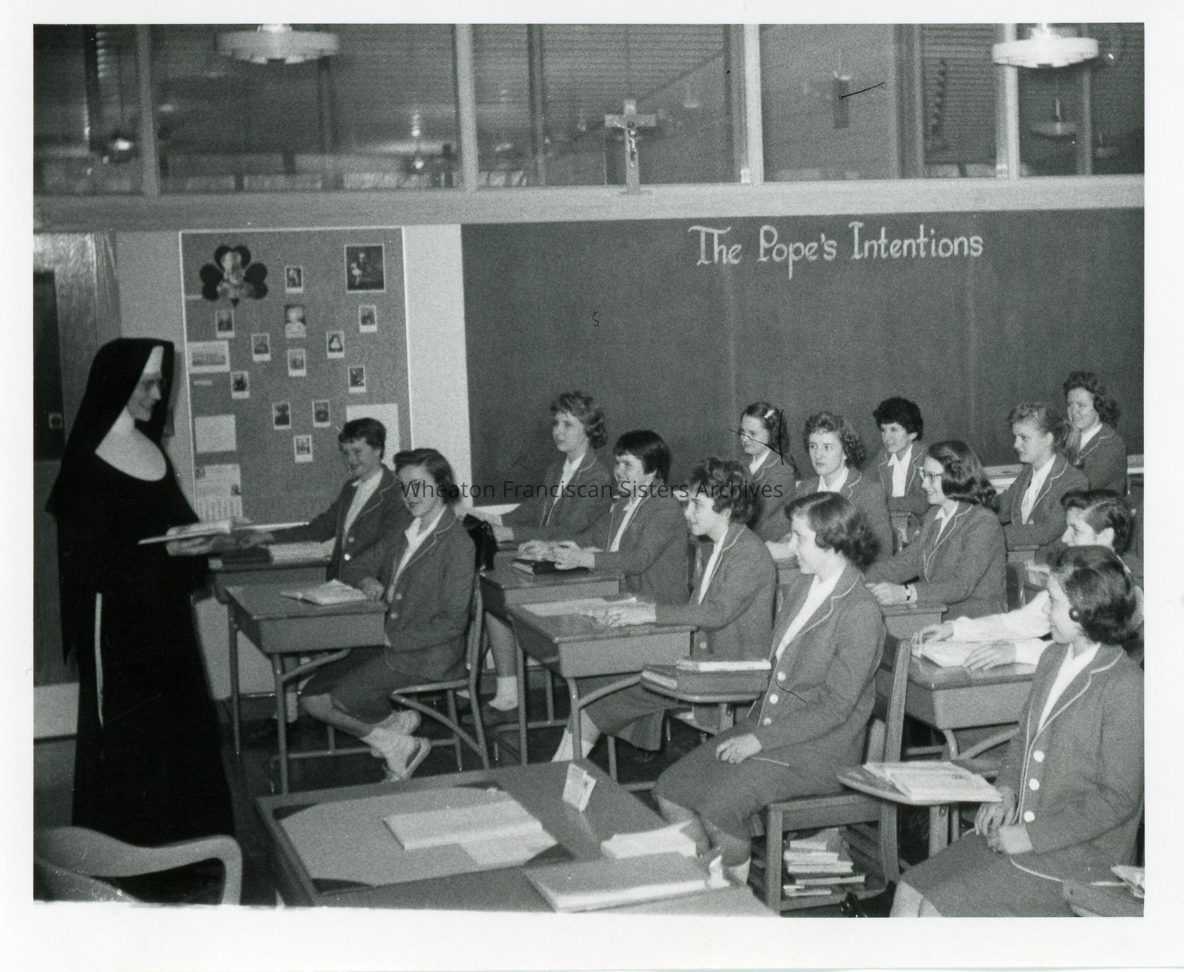 St. Francis High School located at 2130 West Roosevelt Road in Wheaton, Illinois. This image features Sister Frieda (Janice) Teder with students.
