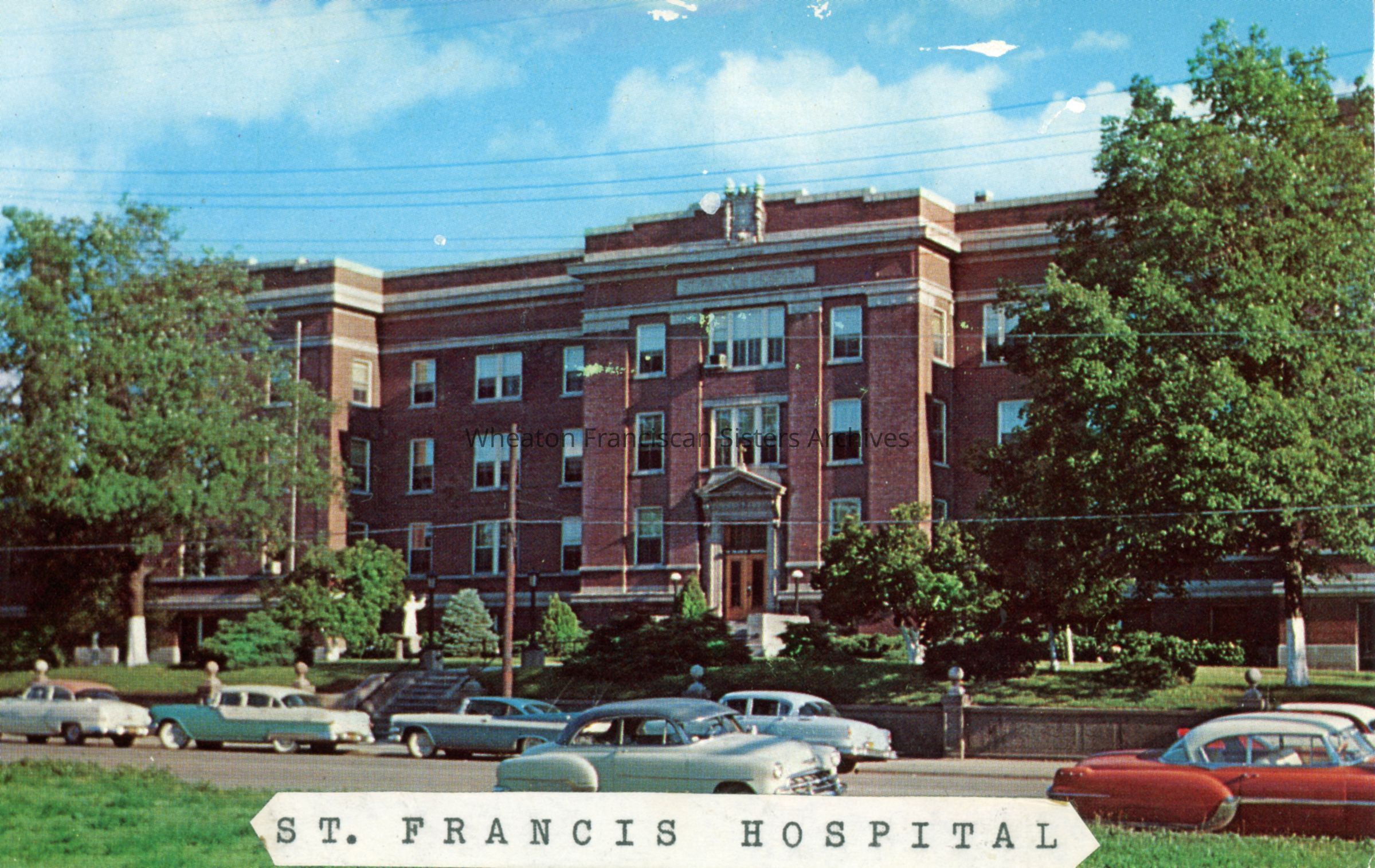 Postcard of St. Francis Hospital at 825 Good Hope Street in Cape Girardeau, Missouri. Opened in 1914, this building replaced an older structure located at Sprigg and Williams Streets. St. Francis remained here until 1976 and the building was demolished in 2000. Affordable housing now occupies the site.