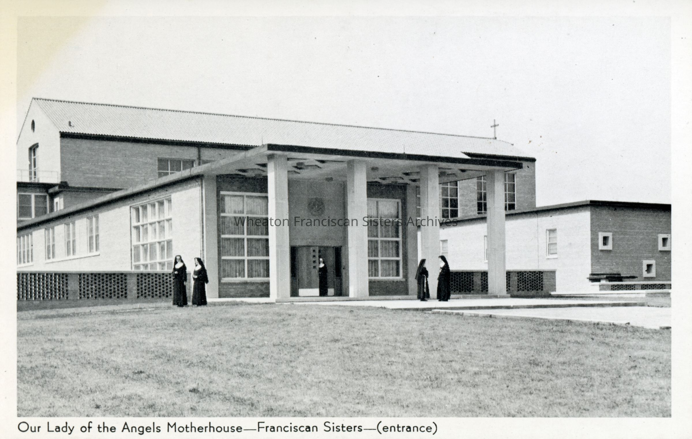 Postcard of the Our Lady of Angels Motherhouse and Novitiate at 26W171 Roosevelt Road in Wheaton, Illinois. This image looks northwest toward the front entrance, later known as Entrance Seven. The chapel is visible in the background and five Sisters are present.
