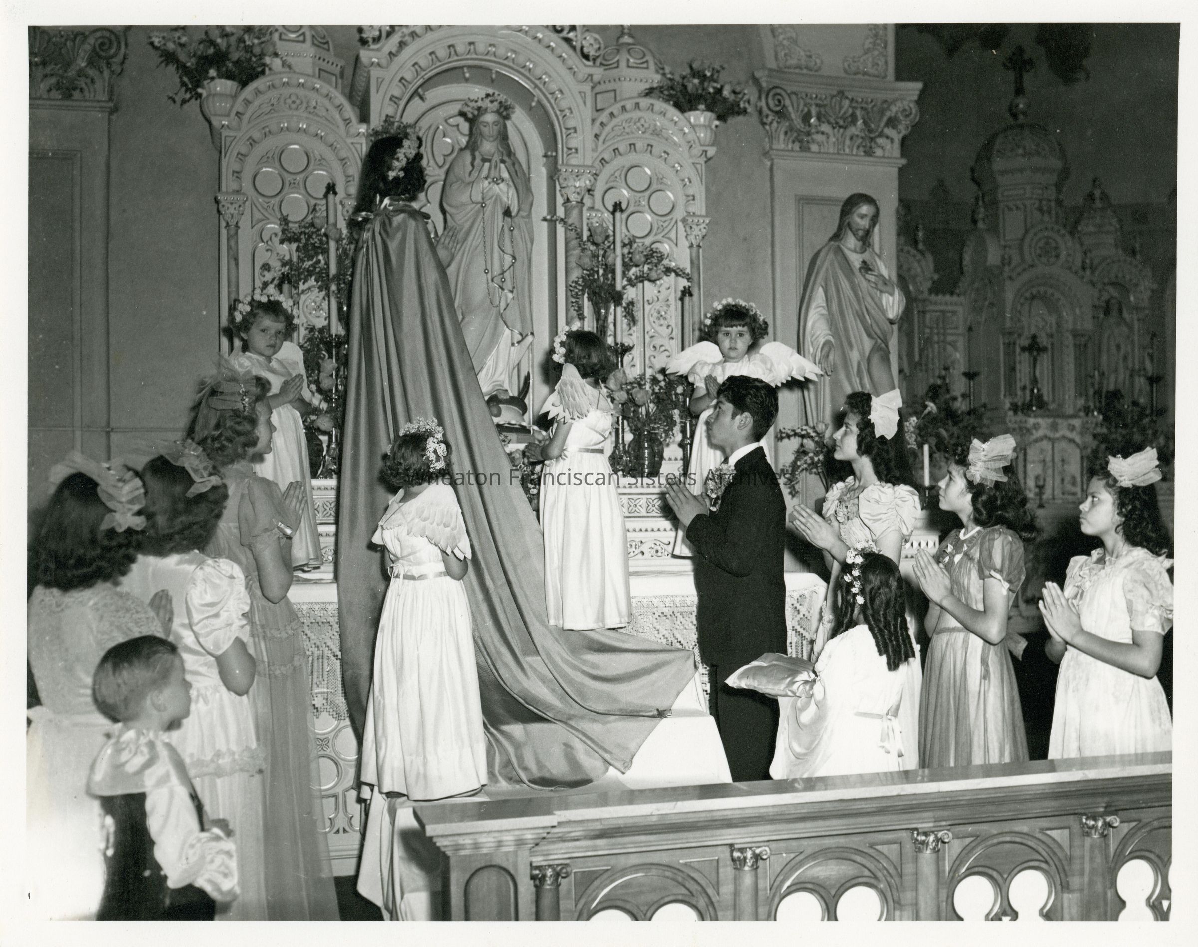 The chapel in St. Clara's Orphanage in Denver, Colorado. This image features children participating in May Crowning. There is a handwritten note on the back from Sister Emma (Edwardine) Lossos.