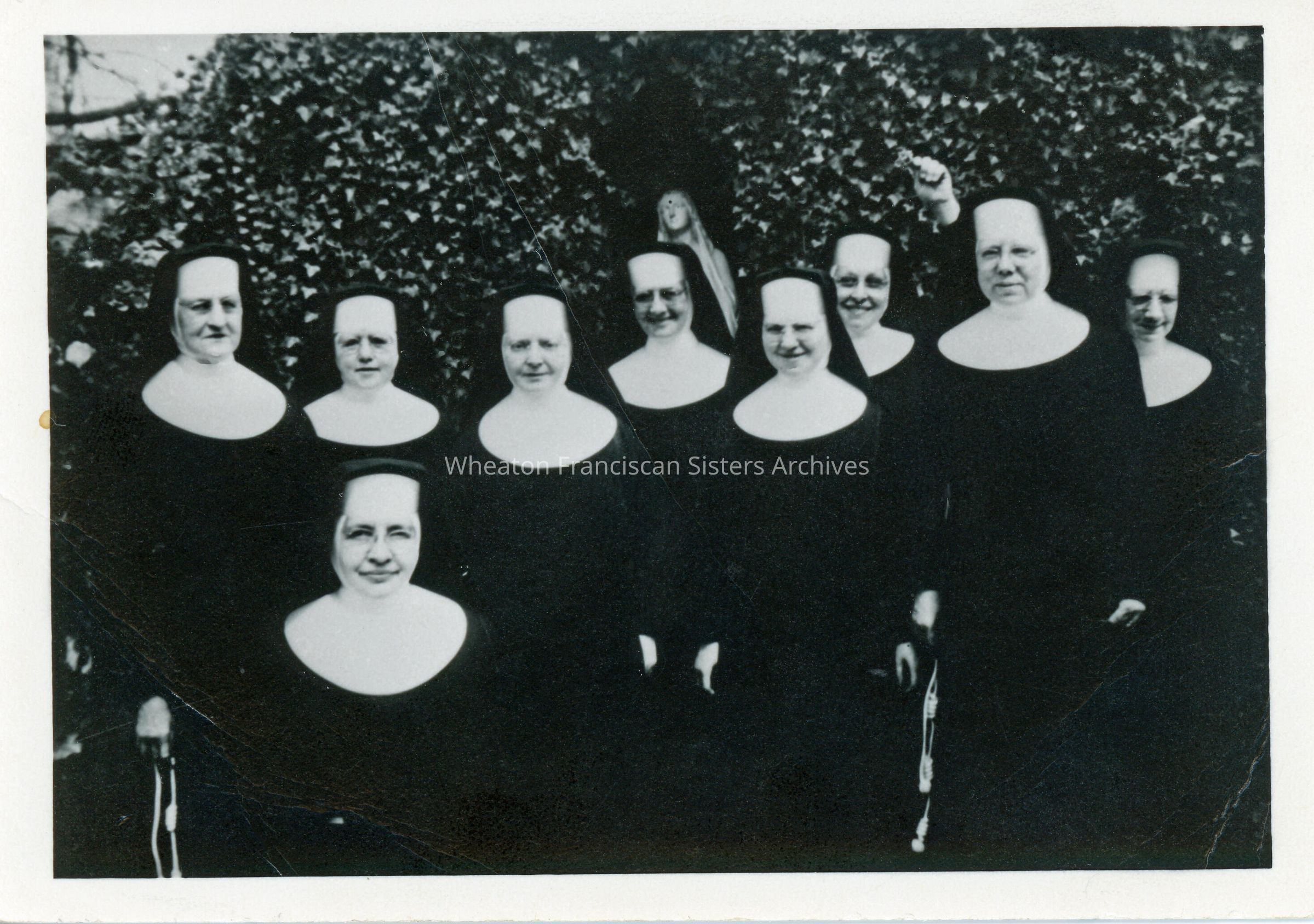 St. Andrew's Hospital located in the 100 Block of South 6th Street in Murphysboro, Illinois. This image features staff gathered at a nearby grotto. From left to right are Sister Agnes (Priscilla) Robers, Sister Theresa (Mary John) Smith, Sister Margaret (Carina) Primus, Sister Angeline (Anita) Willems, Sister Antonette (Bernita) Hermus, Sister Clara (DeChantal) Huber, Sister Teresa (Salome) Yahl and Sister Josephine (Alma) Gettemeier. Sister Mary (Mechtildis/Annmarie) Kuehnbach is seated.