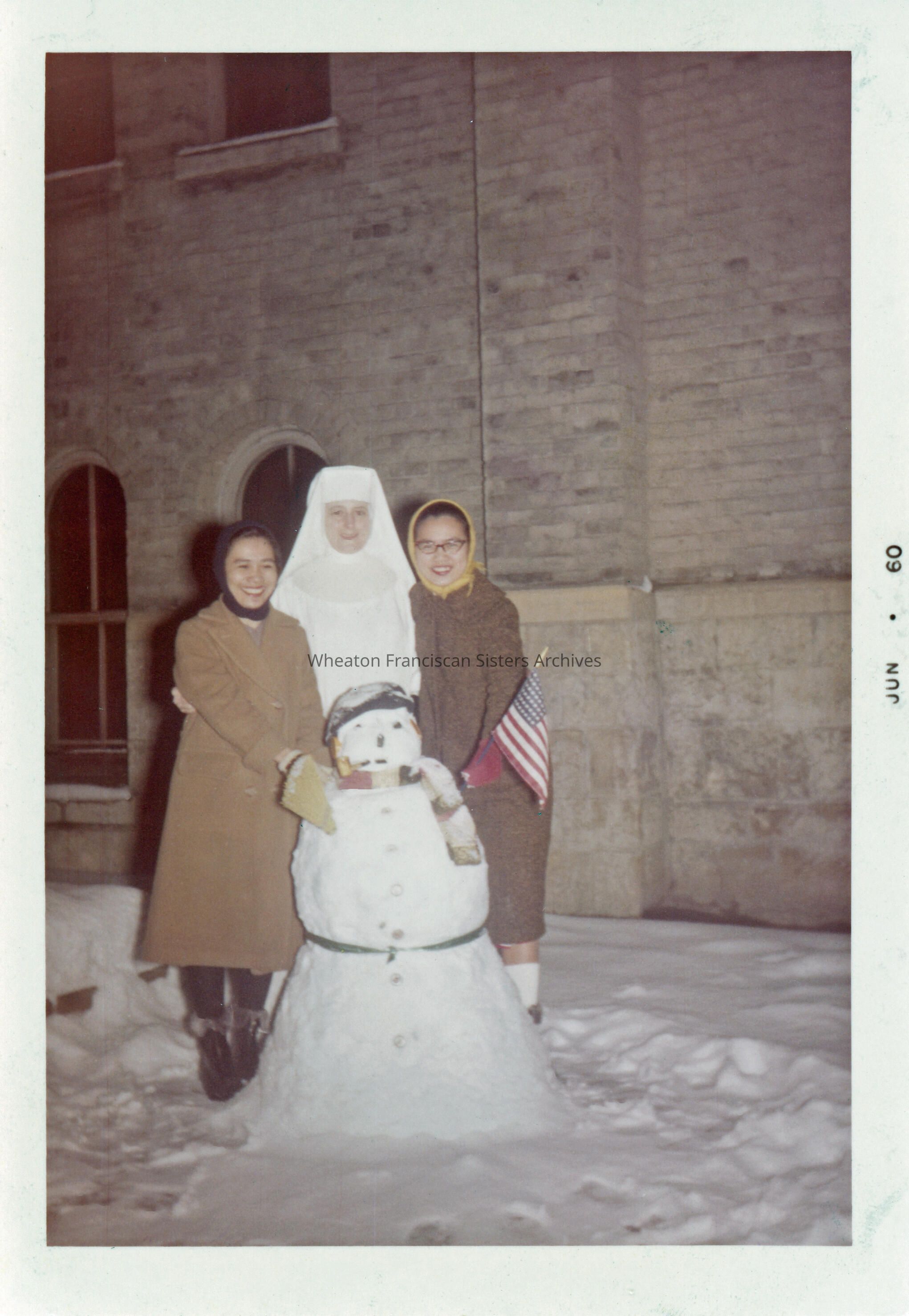 The House of Providence located at 1121 North Orleans Street in Chicago, Illinois. This image features Sister Norberta (Bernard) Windolph building a snowman with two unidentified women.
