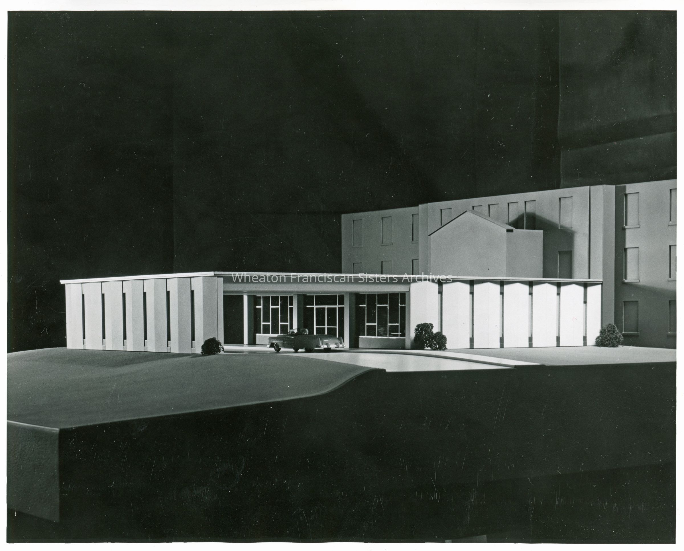 Architectural model of St. Joseph's Hospital located at 5000 West Chambers Street in Milwaukee, Wisconsin. It features a proposed redesign of the main entrance.