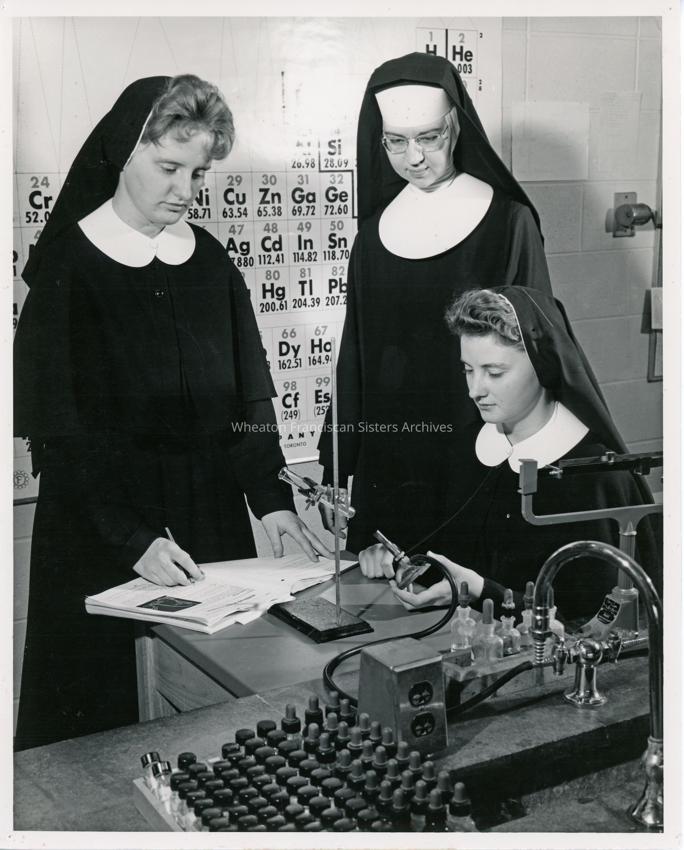 St. Francis High School located at 2130 West Roosevelt Road in Wheaton, Illinois. Sister Audrey (David/Audrey Marie) Rothweil is pictured with two Postulants in science class.