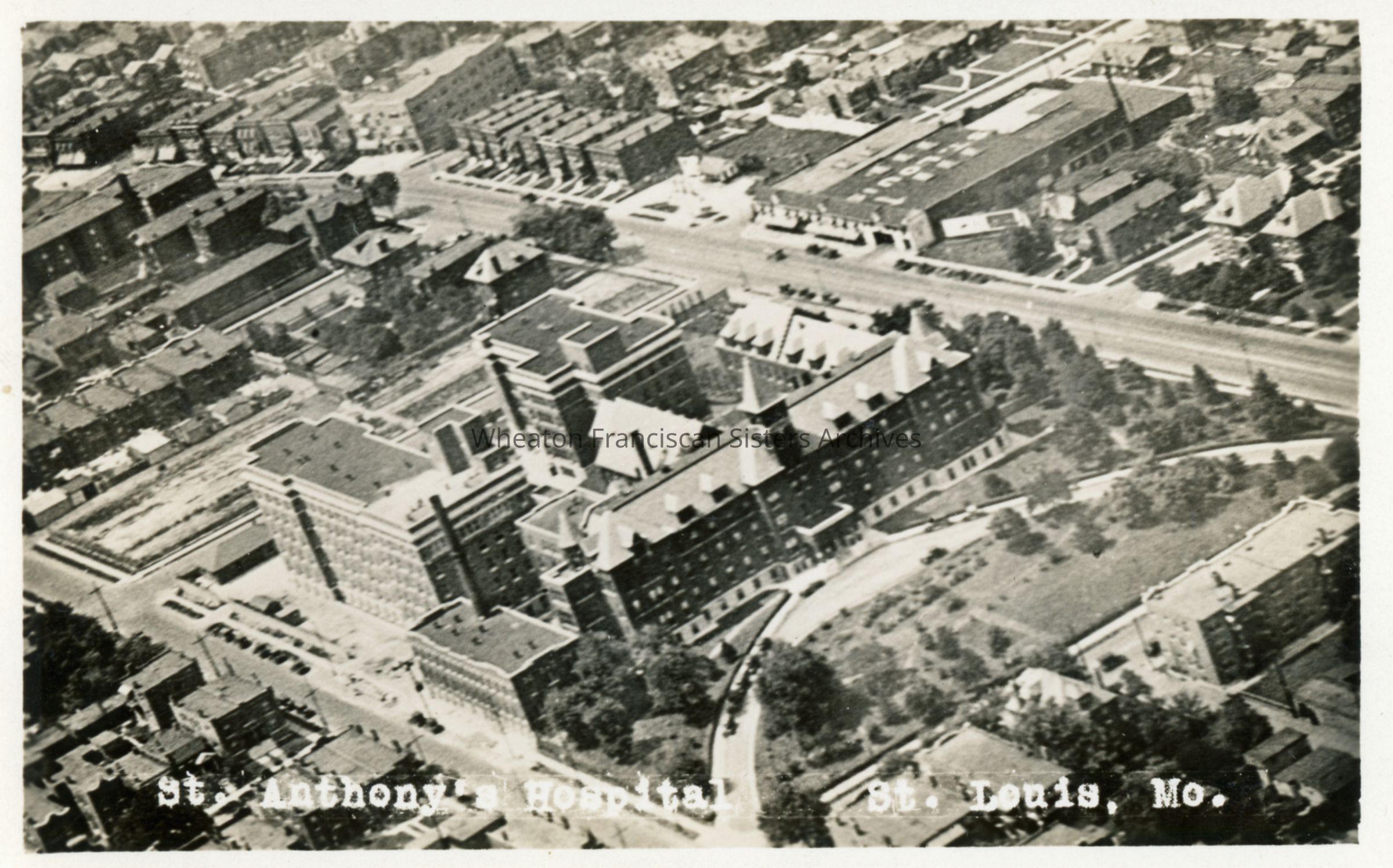 Postcard featuring an aerial view of St. Anthony’s Hospital, Novitiate and Motherhouse located at 3520 Chippewa Street in St. Louis, Missouri.