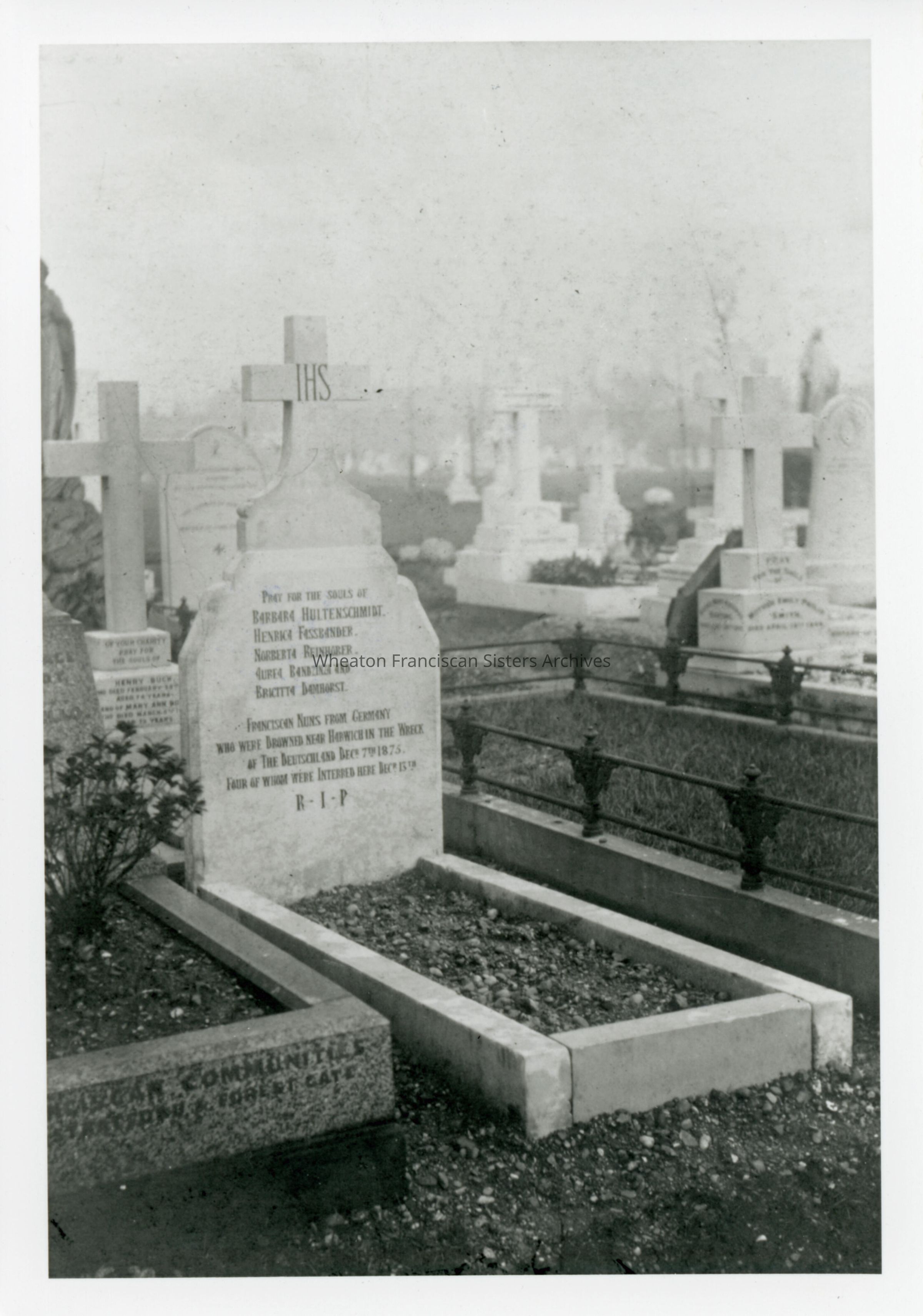 Gravesite for the Franciscan Sisters who perished on the S.S. Deutschland in December of 1875. It is located in St. Patrick's Cemetery in Leytonstone, England. The ship sank after it ran aground off Harwich during a heavy winter storm. Although five Sisters were on the vessel, the body of Sister Henrica (Catherine) Fassbender was never recovered. The four sisters buried at this site are Sister Barbara (Thekla) Hültenschmidt, Sister Brigitta (Elisabeth) Damhorst, Sister Norberta (Johanna) Reinkober and Sister Aurea (Josepha) Badziura. The women were traveling from the motherhouse in Salzkotten, Germany to St. Louis to lead the new American mission.Context