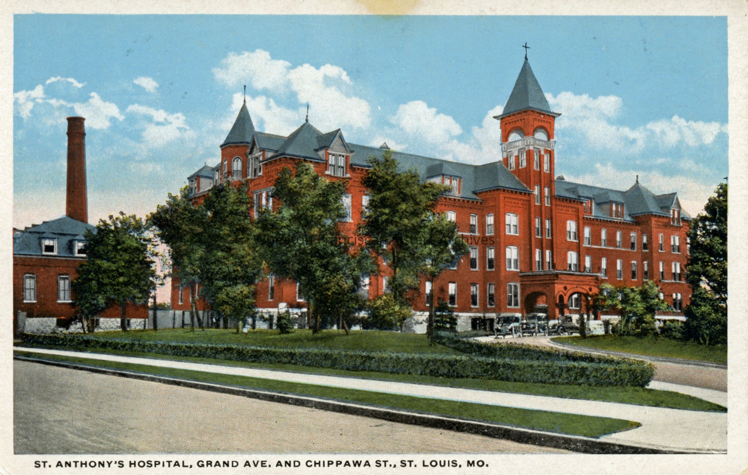 Postcard featuring St. Anthony’s Hospital, Novitiate and Motherhouse located at 3520 Chippewa Street in St. Louis, Missouri.