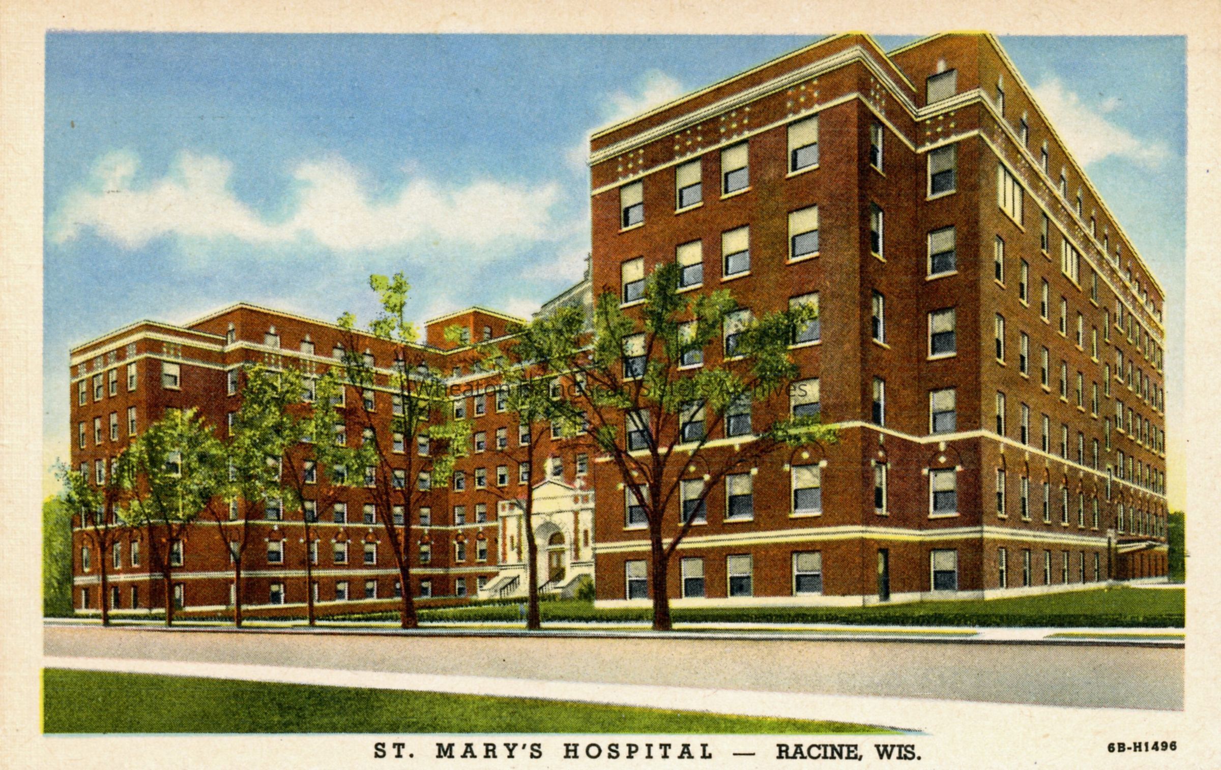 Postcard of St. Mary's Hospital at 16th Street and Grand Avenue in Racine, Wisconsin. This structure was completed in 1933. There is a handwritten message on the back from Sister Laura (Humilitas) Broekelmann to Sister Patricia in Wheaton, Illinois.