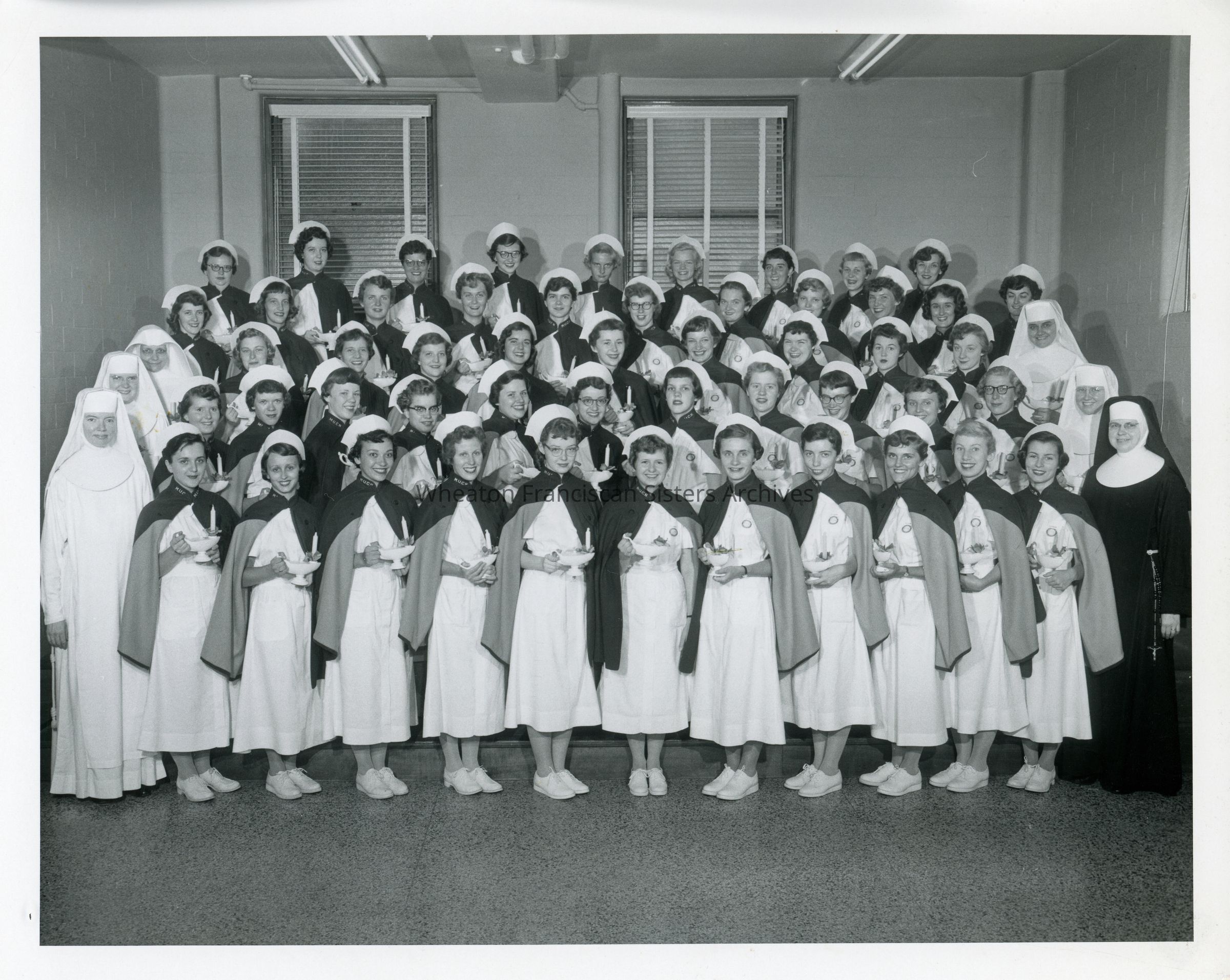 Graduating students of the Marquette University College of Nursing, formerly the St. Joseph's Hospital School of Nursing. Those present include Sister Ruth (Louis) Gauthier, Sister Ethel (Helene) Van Domelen, Sister Julia (Thomas) Kolba, Sister Carole (Juanita) Siegel and Sister Elizabeth (Genevieve) Jansen.