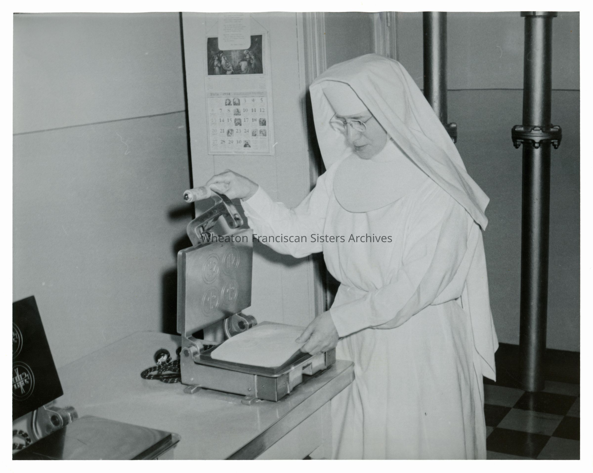 St. Rose Residence located at 952 10th Street in Denver, Colorado. A home for young working women, this image features Sister Helena (Olga) Koch making altar bread. At different times, this location was known as St. Clara's Convent, St. Rose's Convent, St. Rosa's Home and was once the site of St. Clara's Orphanage.