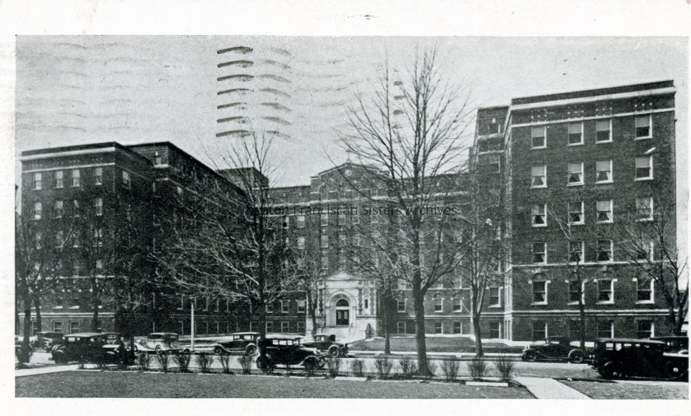 Postcard of St. Mary's Hospital at 16th Street and Grand Avenue in Racine, Wisconsin. This structure was completed in 1933. There is a handwritten message on the back addressed to Sister Mary (Leonarda) Forster at St. Elizabeth's Hospital in Appleton, Wisconsin.