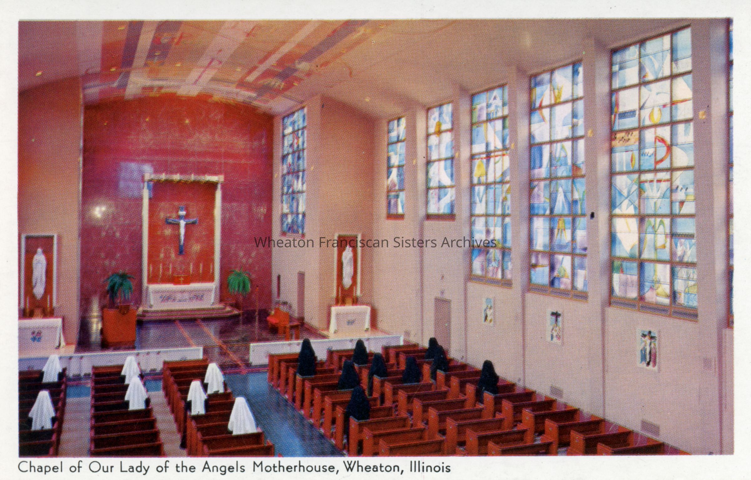 Postcard of the Our Lady of Angels Motherhouse Chapel at 26W171 Roosevelt Road in Wheaton, Illinois. A number of Sisters are present.