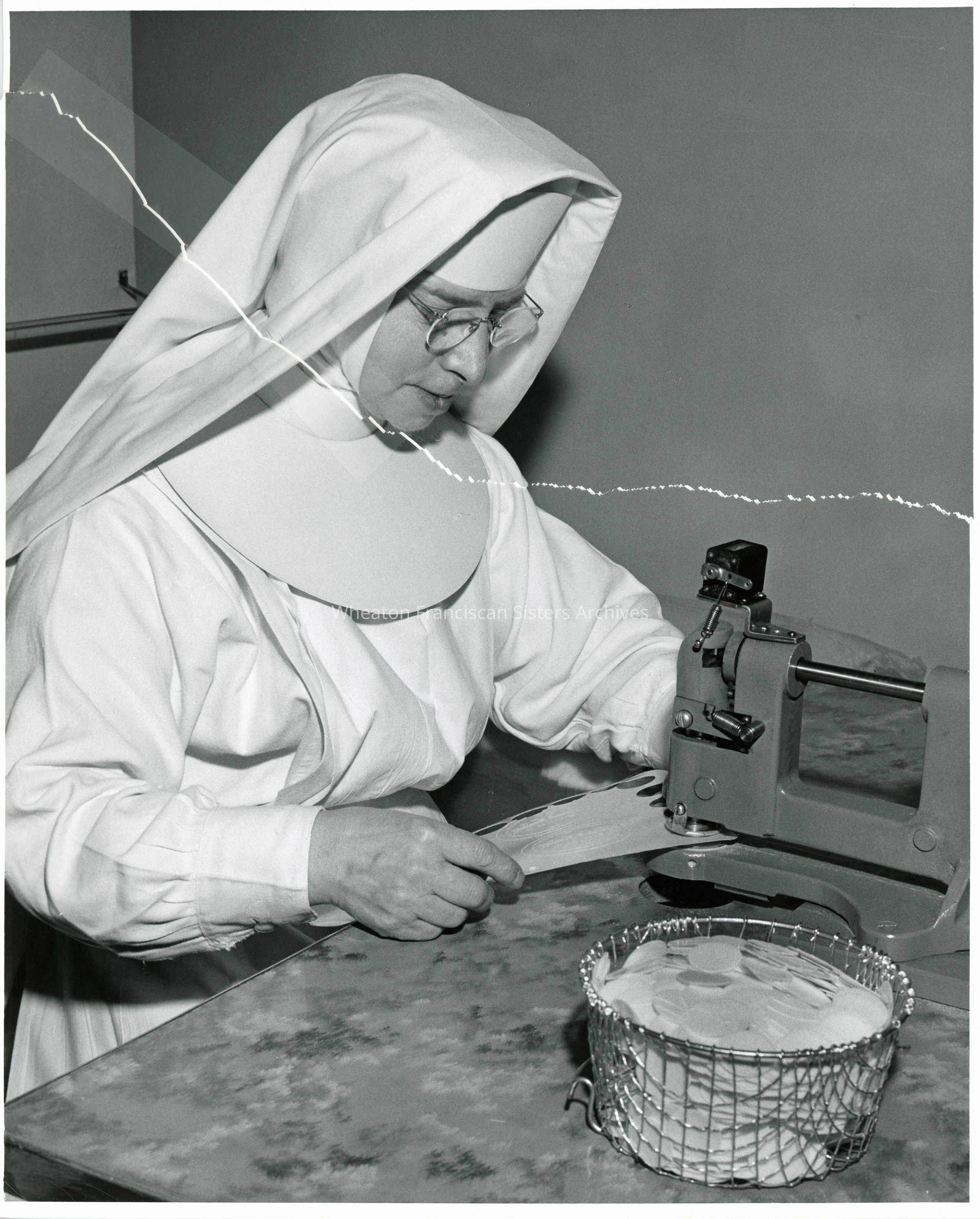 St. Rose Residence located at 952 10th Street in Denver, Colorado. A home for young working women, this image features Sister Helena (Olga) Koch making altar bread. At different times, this location was known as St. Clara's Convent, St. Rose's Convent, St. Rosa's Home and was once the site of St. Clara's Orphanage.