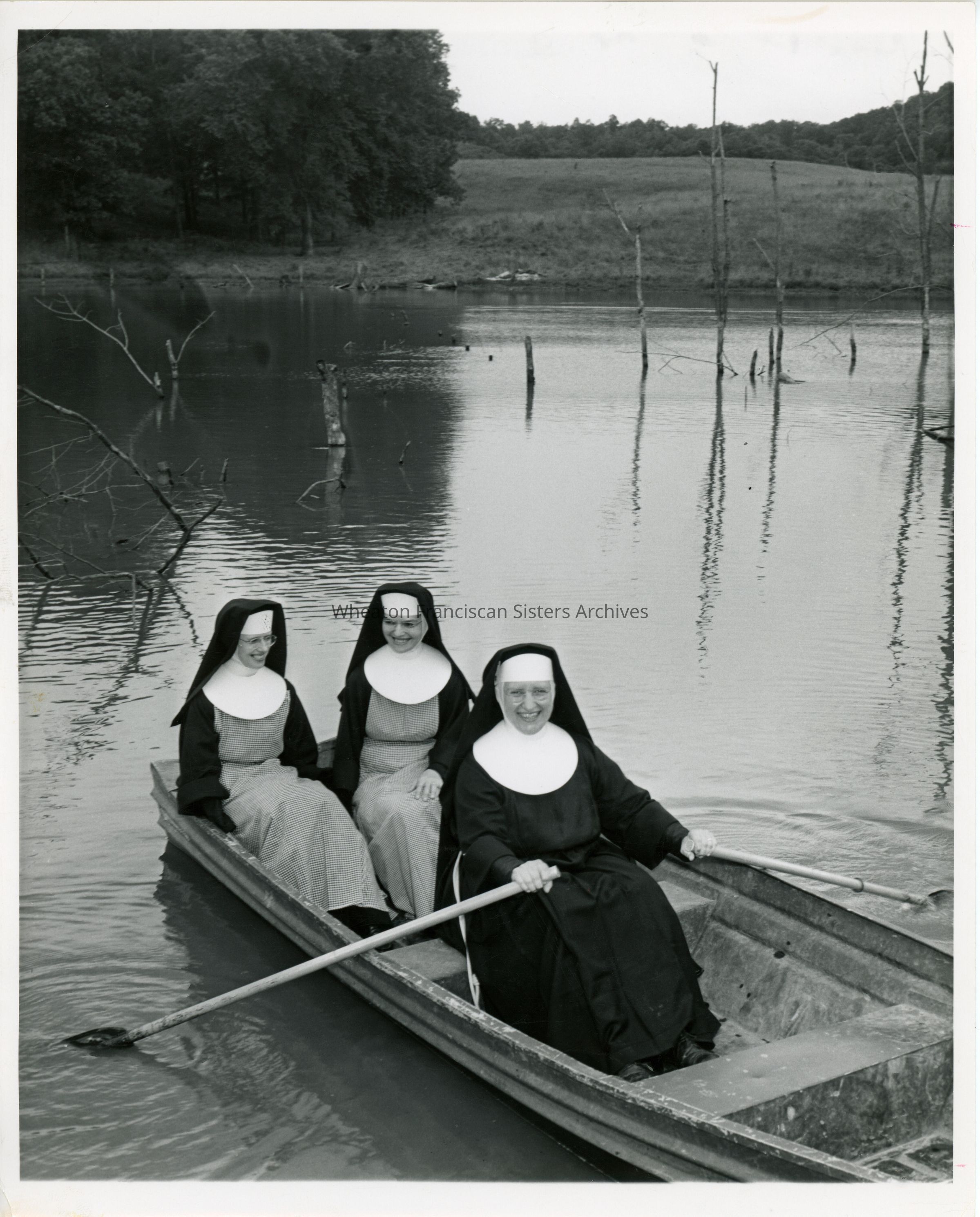 Sisters in Cape Girardeau, Missouri. This image features, from left to right, Sister Margaret (Audrey) DeHaus, Sister Alma (Giles Teder) and Sister Gertrude (Virgilia) Beikler. The women were enjoying a boat ride at the Fuerth Farm.