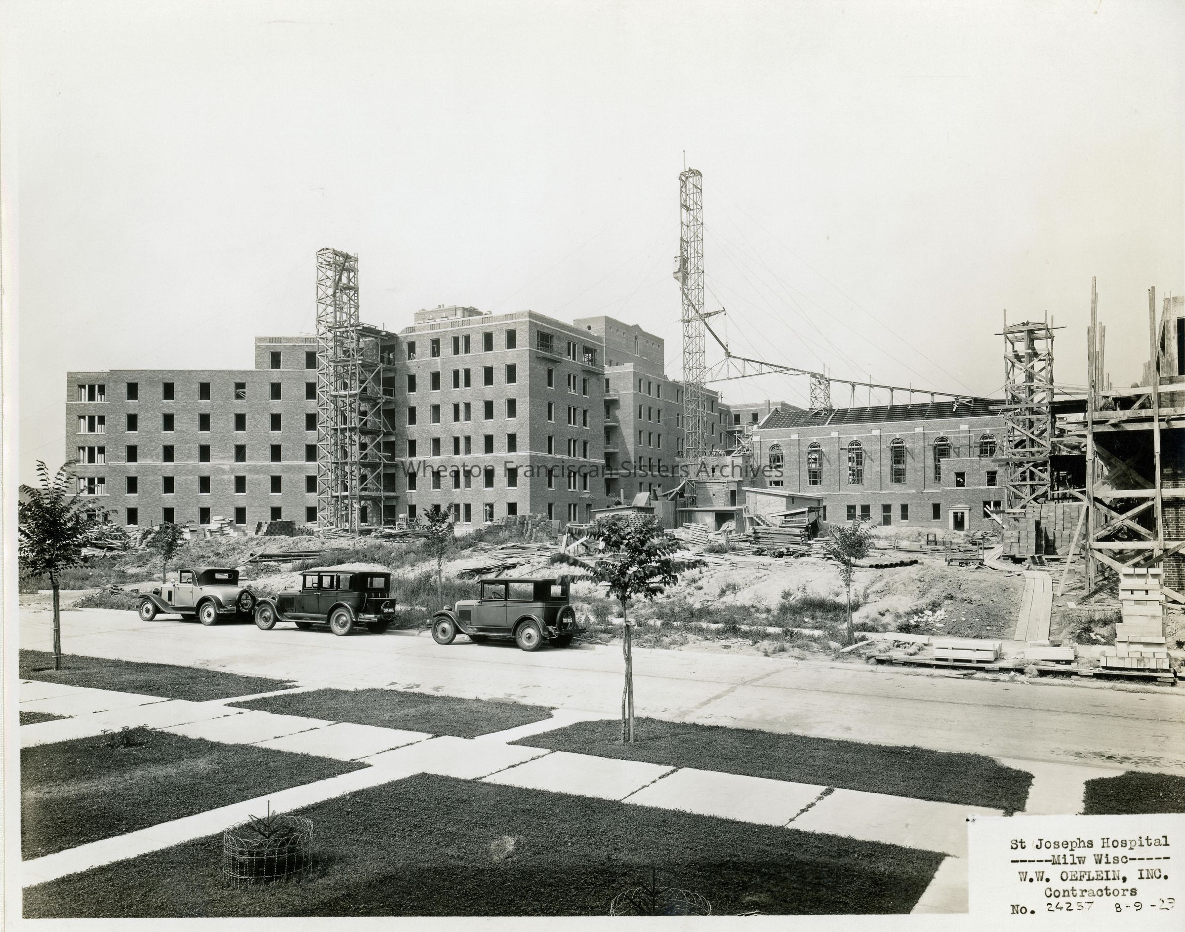 Construction of St. Joseph's Hospital located at 5000 West Chambers Street in Milwaukee, Wisconsin. The contractor is listed as W. W. Oeflein Inc.