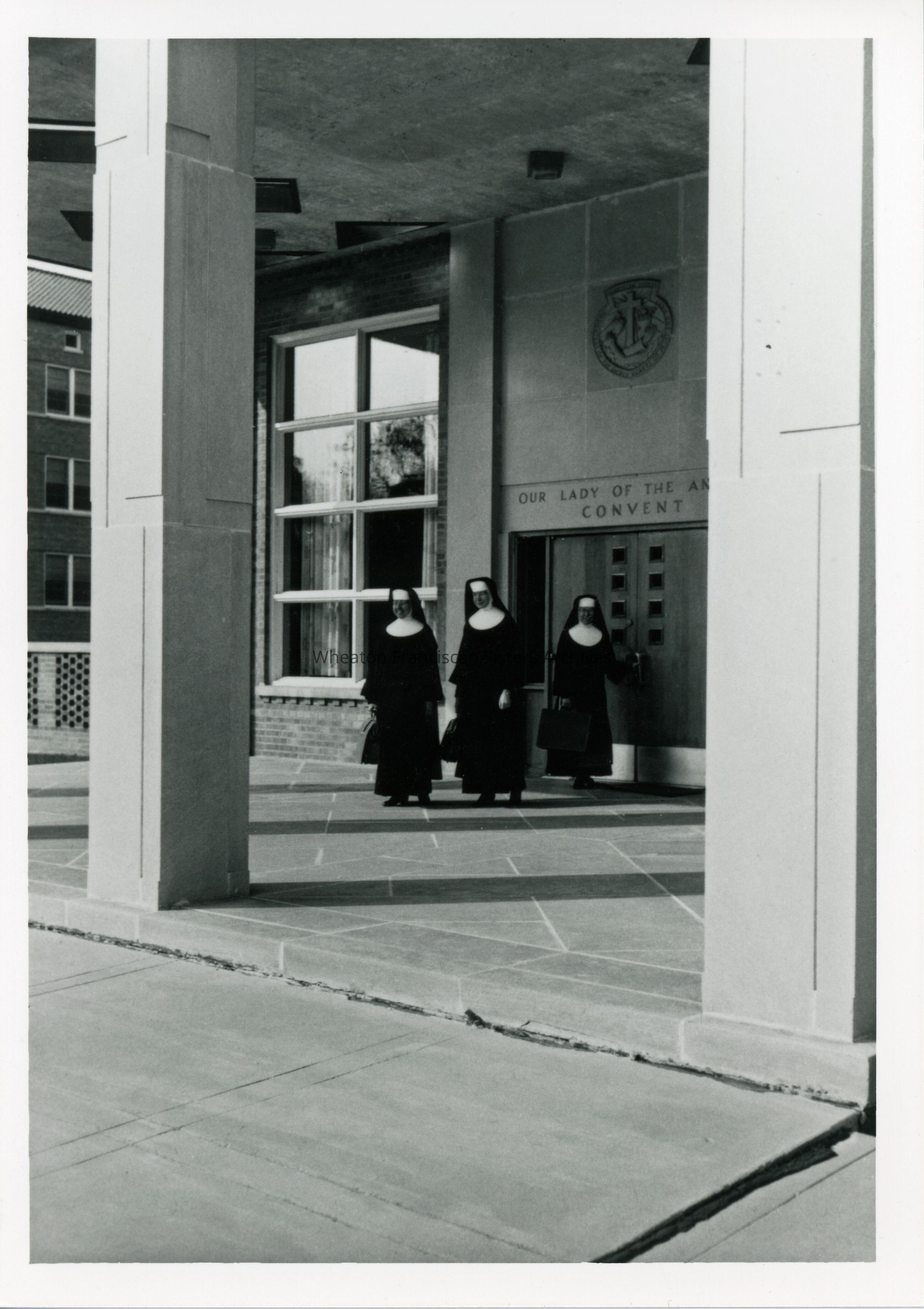 Sisters leaving the Our Lady of Angels Convent to teach at nearby St. Francis High School. This image features Sister Marian (Maurice) Keeven, Sister Agnes (Johnathan) Jiskra and Sister Marion (Claude) Cronk. The school was located at 2130 West Roosevelt Road in Wheaton, Illinois.
