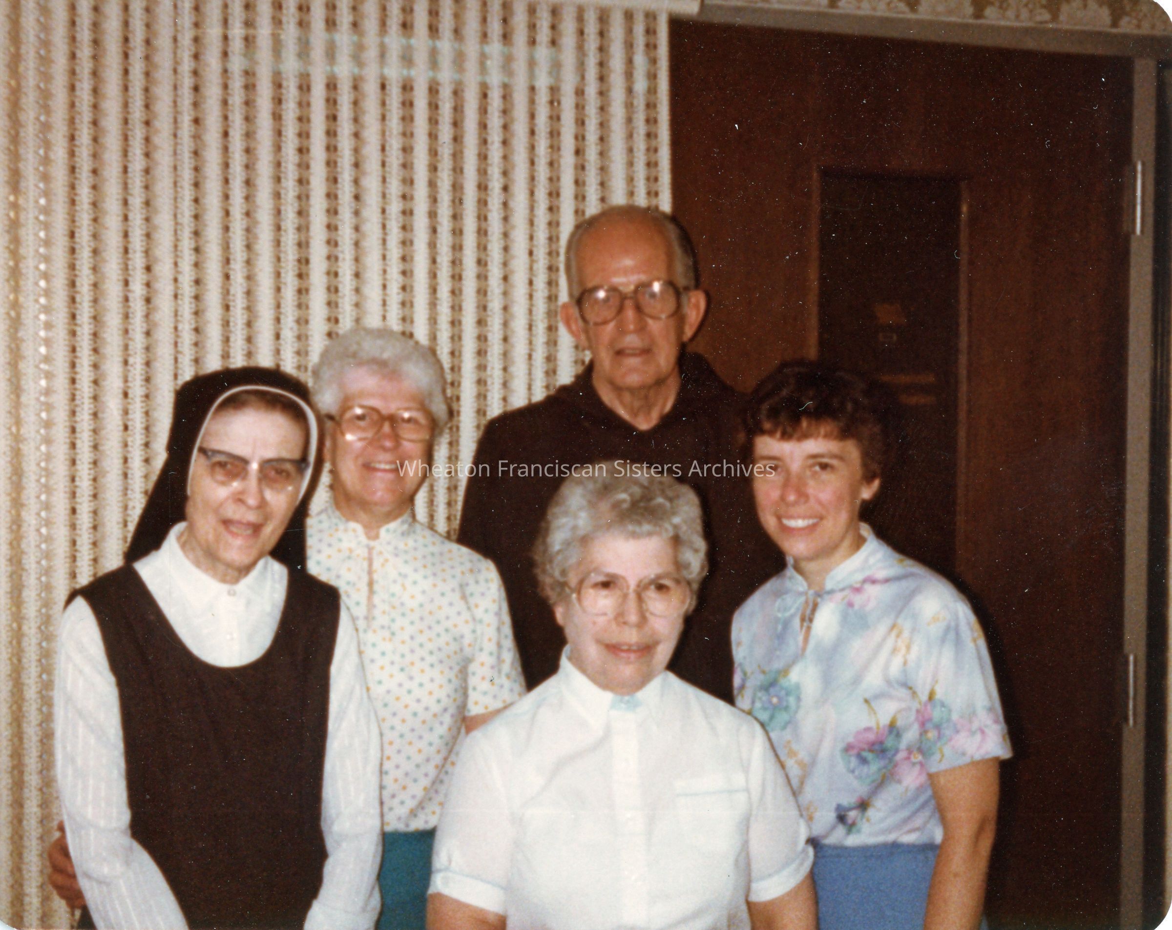 Clare Gardens located at 26th Avenue and Osceloa Street in Denver, Colorado. From left to right are Sister Josephine (Mary Josephine) Martinelli, Sister Magdalene "Maggie" (Daniel) Ryan, Sister Ernestine (Helen) Duran and Sister Mary Barbara (Theresa) Langfield. In the back is Father Neil Mehaffey who served as chaplain.